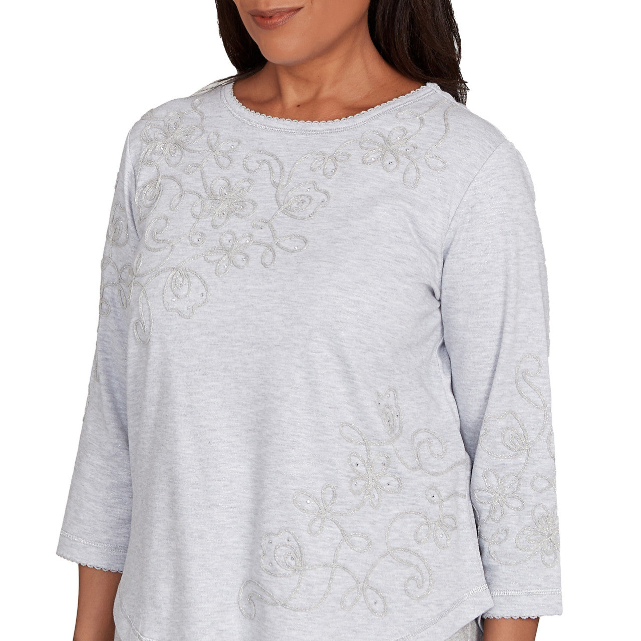 This asymmetrical floral soutache top features intricate detailing along the neckline and hem of the sleeves. With three-quarter sleeves and a crew neckline, the textured soutache embroidery on both the shirt and sleeves adds a touch of artistry to this elegant piece.