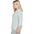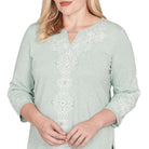This soft knit top features an intricate metallic embroidered scroll design at the center for a touch of timeless charm. Finished with a keyhole neckline, three-quarter sleeves, and a straight hem, it's a feminine favorite that layers beautifully and wears with ease.