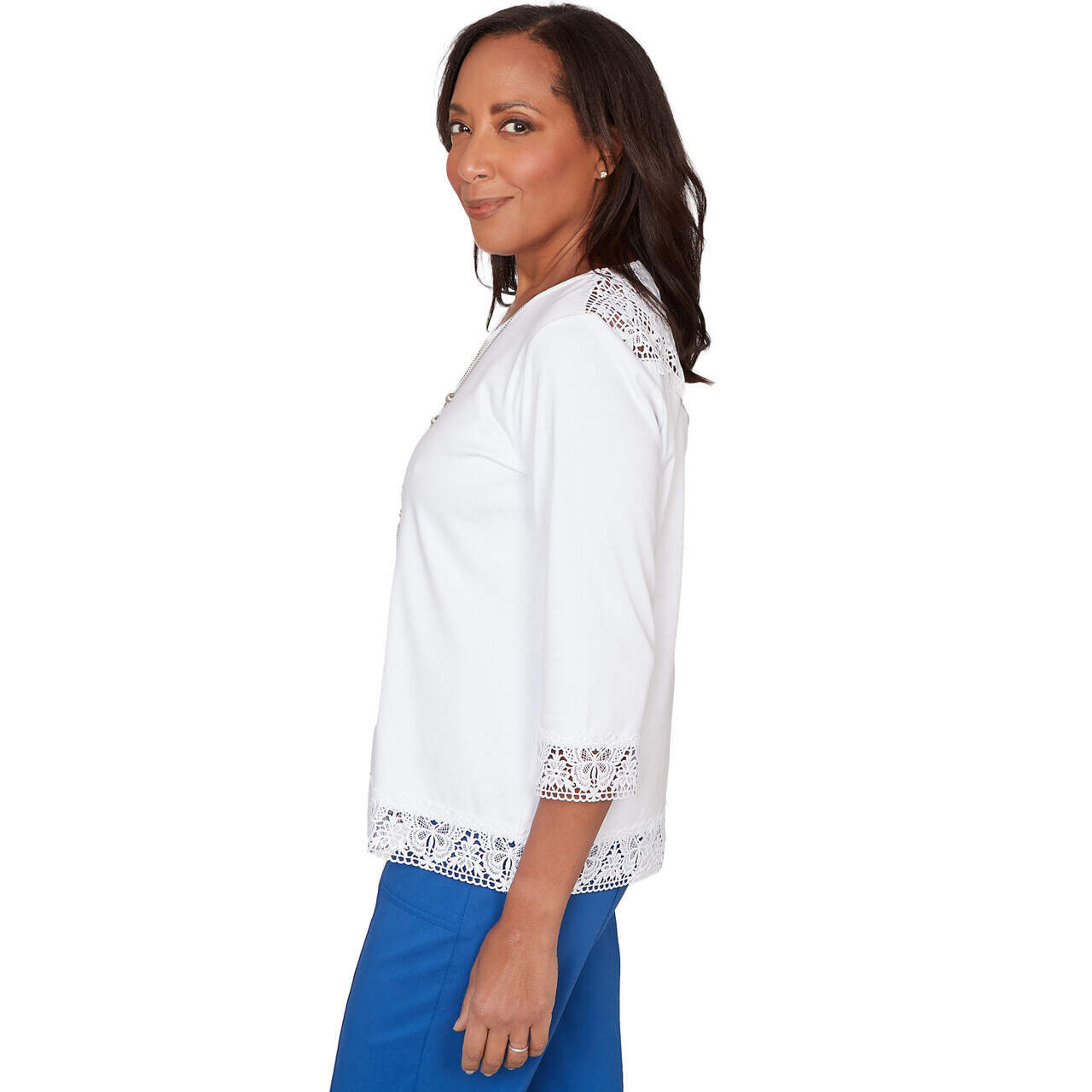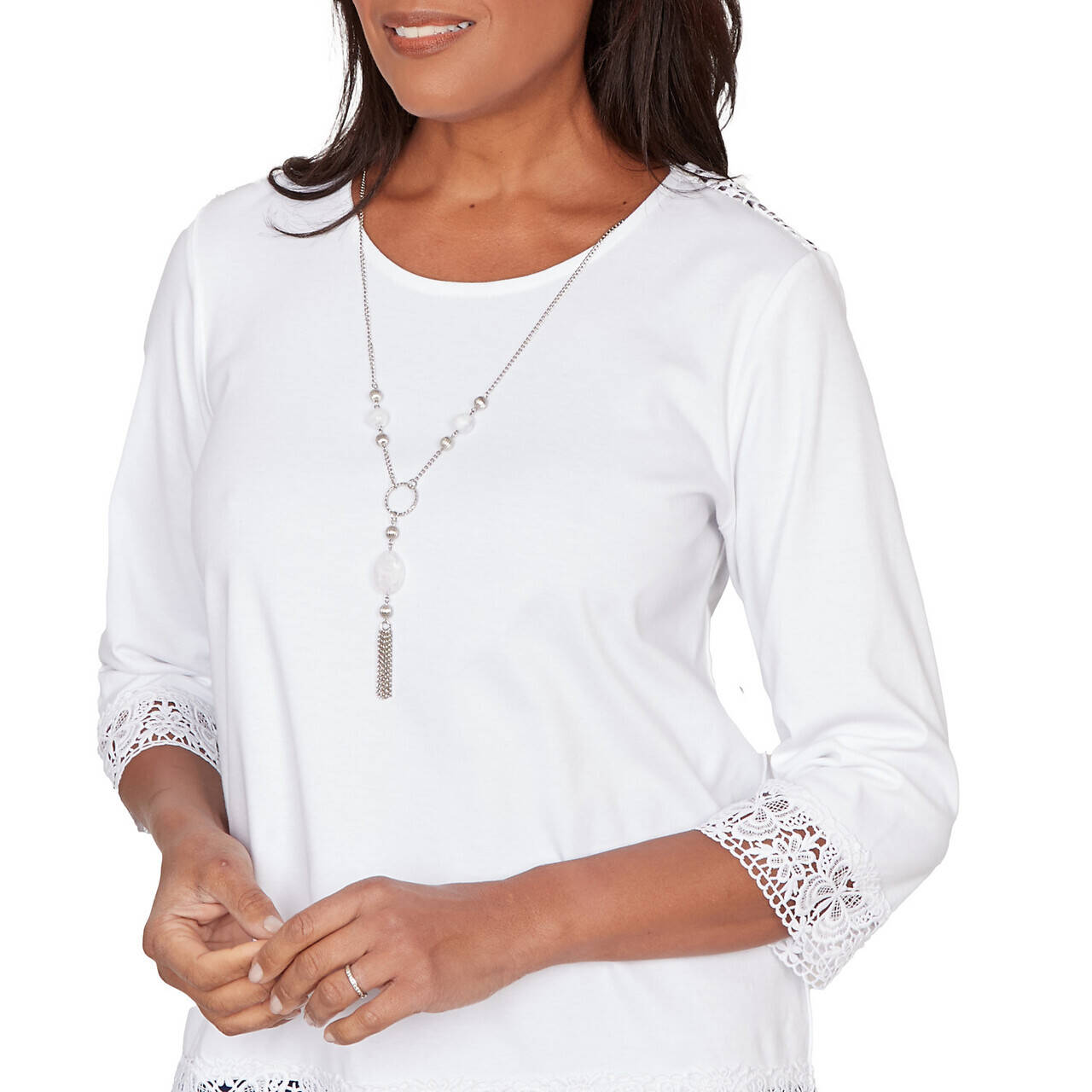 Delicate lace trim frames this romantic three-quarter sleeve top. Finished with a straight hemline and a coordinating necklace, it offers a softly graceful look ready for any spring moment.
