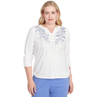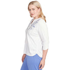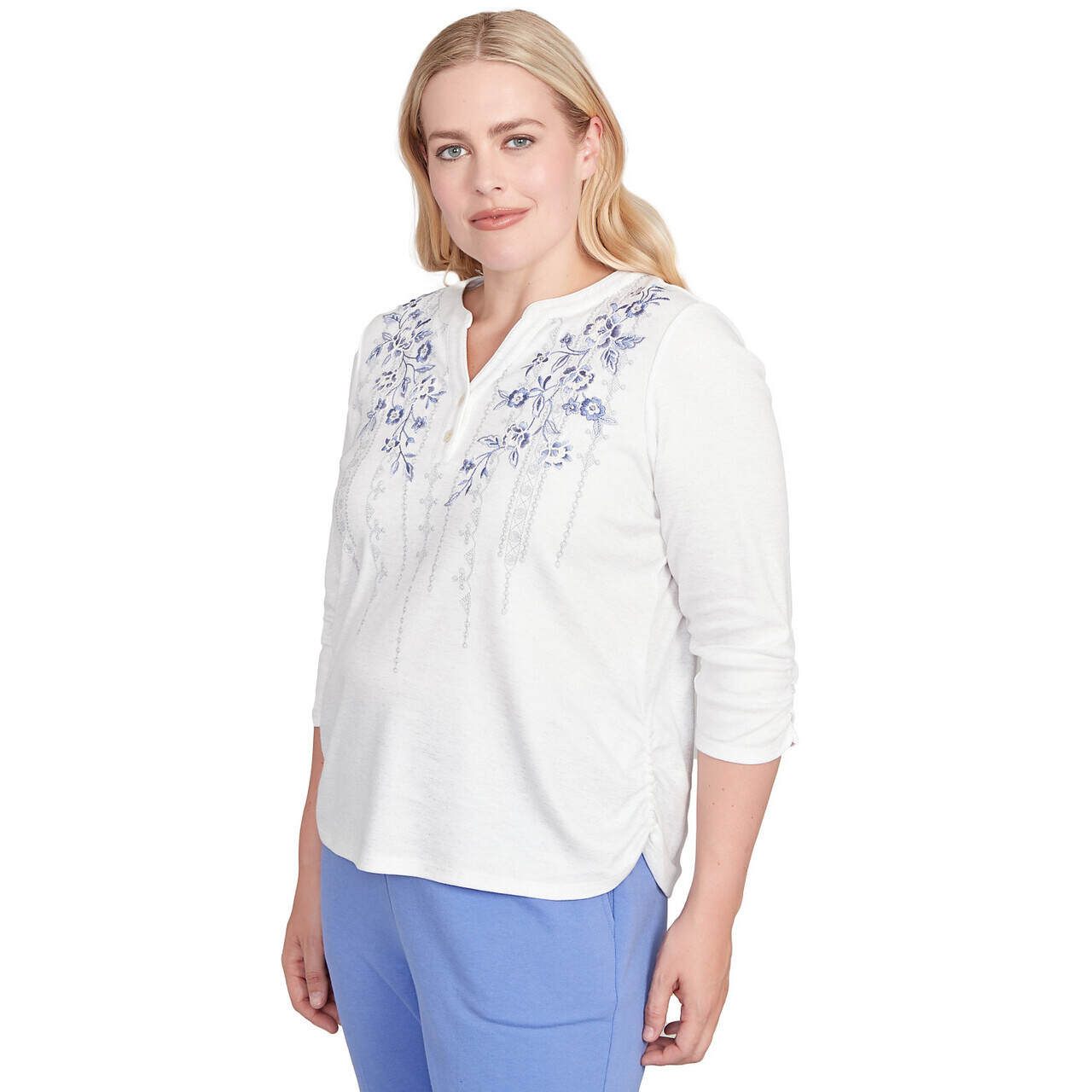 A graceful blend of floral and geometric artistry shapes this soft knit henley top, featuring a split neckline with a delicate button closure. Ruched three-quarter sleeves and gentle side gathers create a flattering silhouette with effortless charm.
