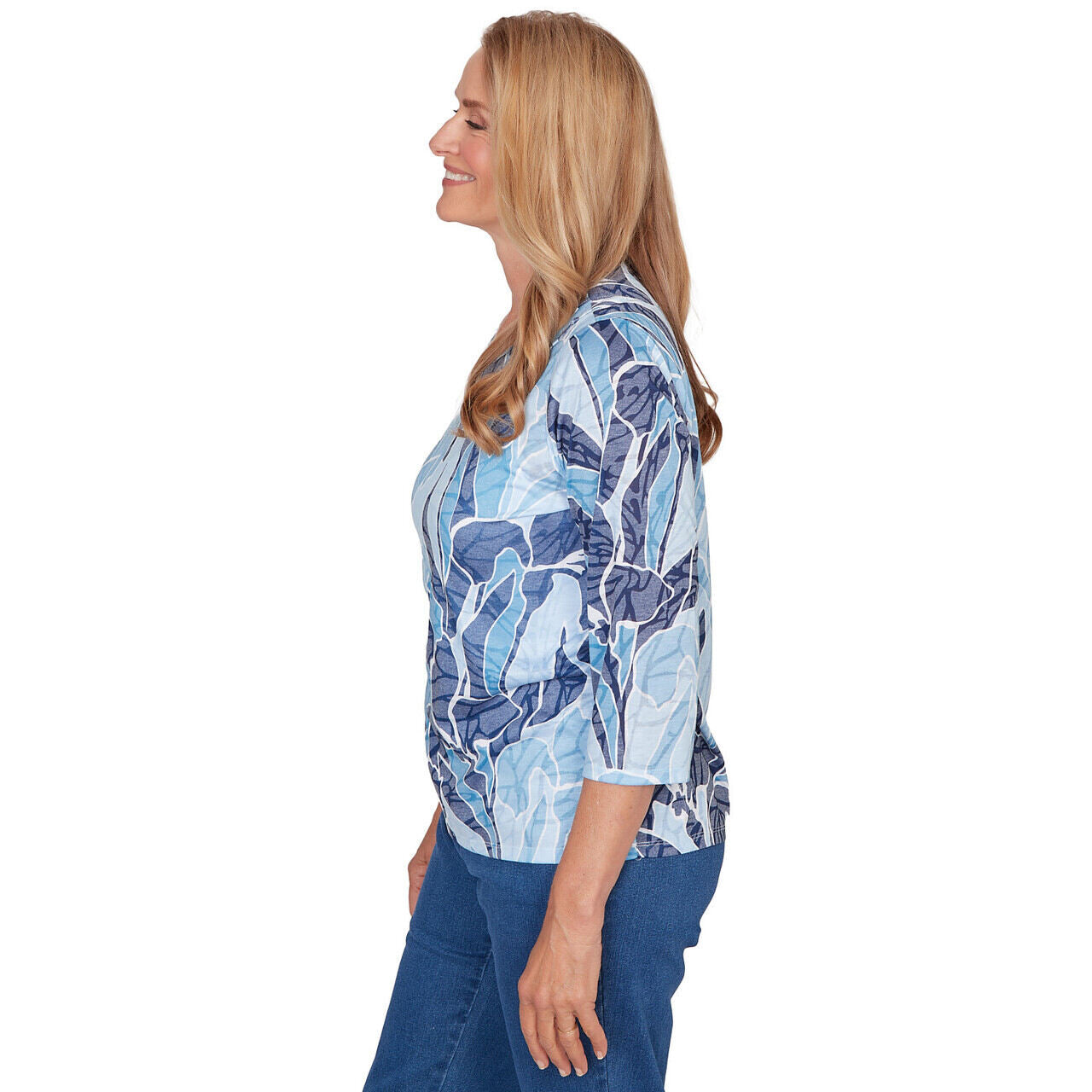 Soft tonal blues and leafy silhouettes create a patchwork effect across this knit top. At the neckline, interwoven knotted embellishments add a touch of artistry to the classic crew shape. Finished with three quarter sleeves and a straight hemline, it's a modern take on feminine detail.