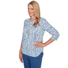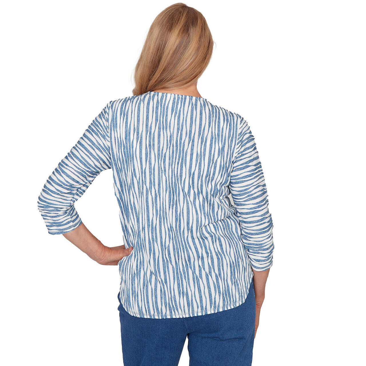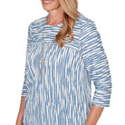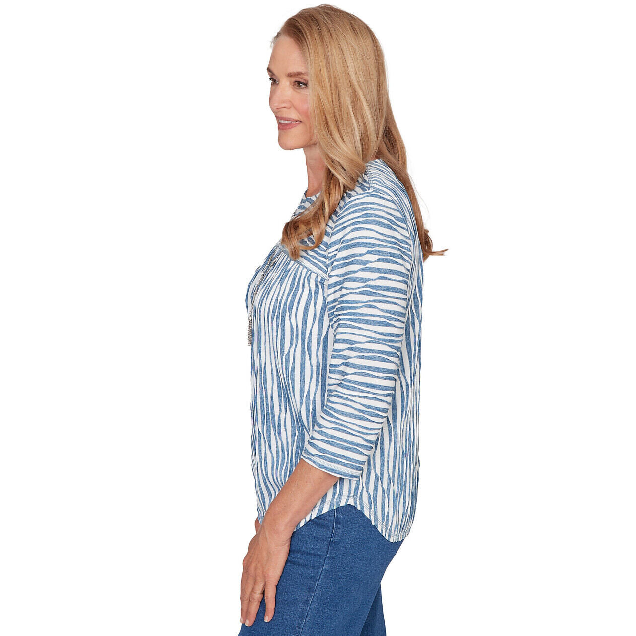 Playful textures meet bold contrast in this spliced knit top. The crew neckline is framed by a detachable necklace, while the mix of vertical and horizontal patterns adds dimension to the design. Finished with three quarter sleeves and a curved hemline, it's a fresh twist on casual charm.