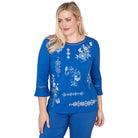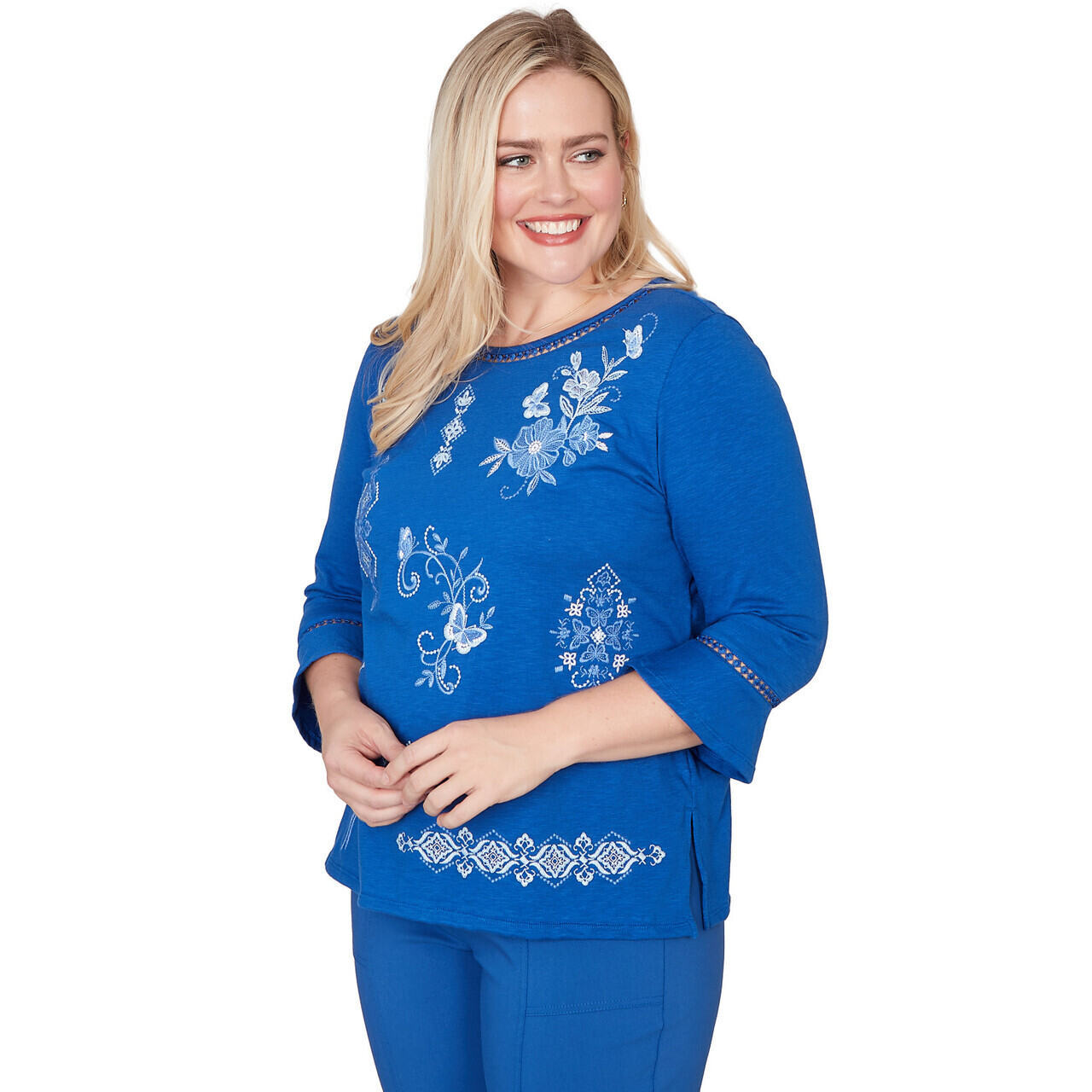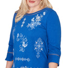 An embroidered placed medallion floral design decorates this three-quarter sleeve crew neck top with rich, painterly detail. The straight hemline keeps the silhouette polished and flattering.