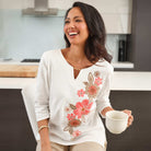 This ethereal top features a flattering split neckline that showcases the delicate floral embroidery. The three-quarter sleeves and straight hemline create a timeless silhouette. Perfect for a dreamy summer day or a romantic evening, this top is sure to make you feel beautiful.