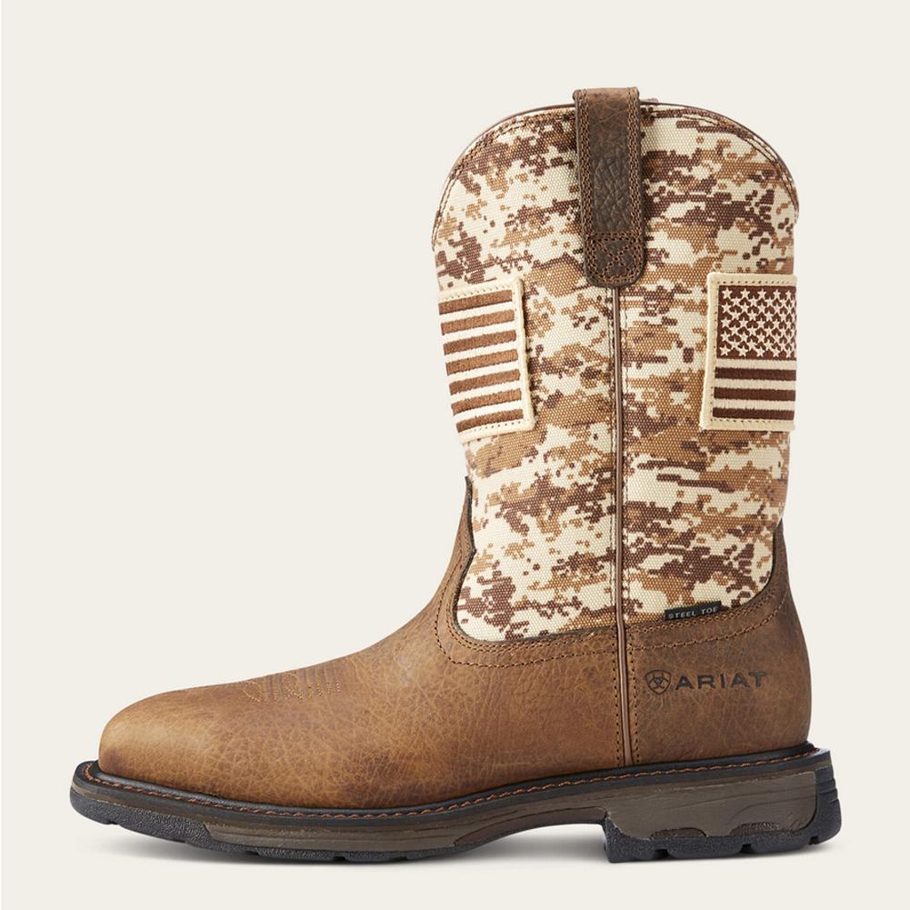Ariat WorkHog Patriot Steel Toe Work Boot show pride on the job with work boots styled with an American flag and camo pattern. The WorkHog® Patriot's extra-wide stability shank helps keep you supported on the job. These performance work boots are engineered to provide all-around comfort and reduced foot fatigue.