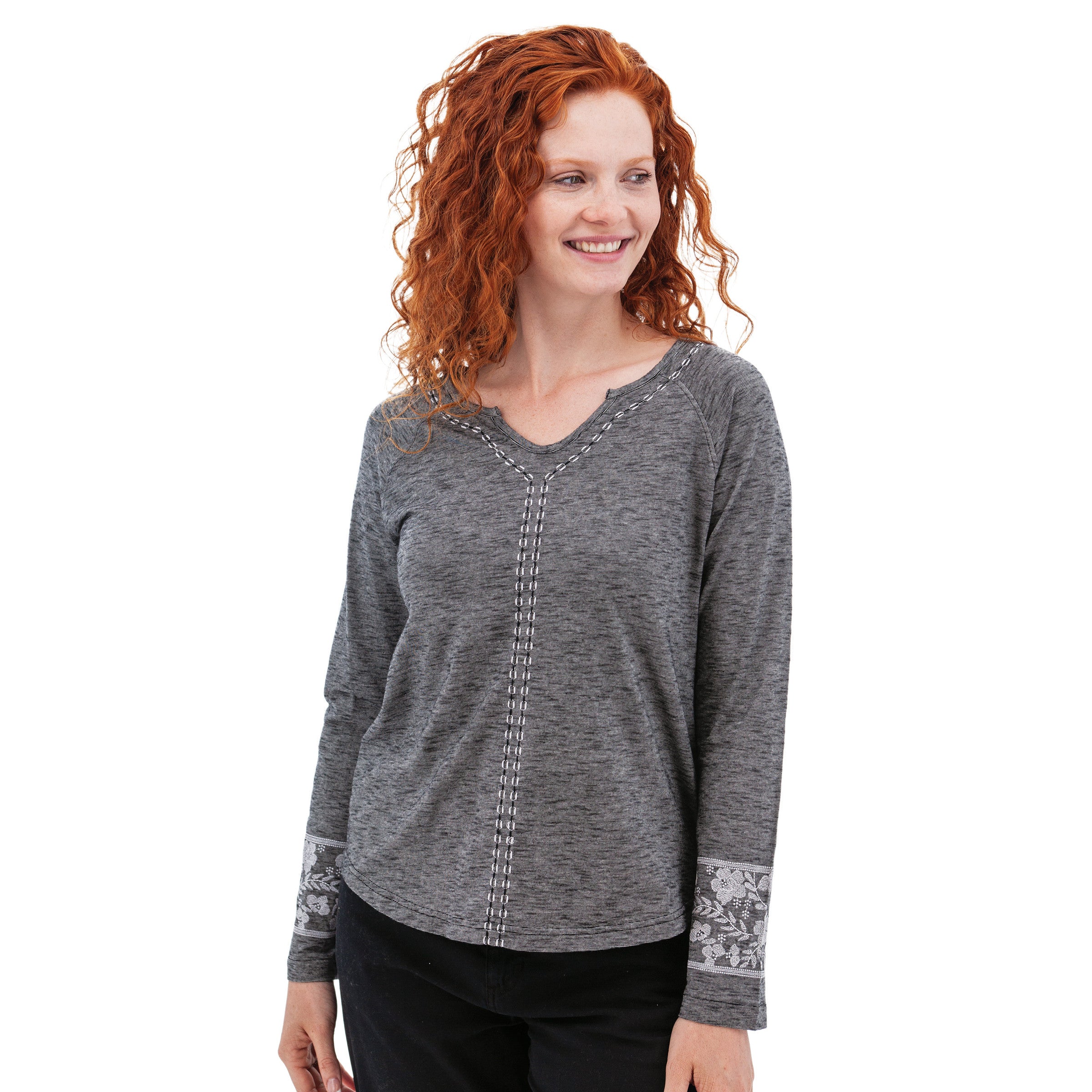 Make your wardrobe a little greener and a lot more stylish with the Crispin Embroidered Raglan Top. Crafted from organic cotton, TENCEL™ Lyocell, and spandex, this top is soft, breathable, and designed for all-day comfort. And the details? Oh, they're gorgeous. The embroidery on the cuffs features an intricate floral pattern, while the embroidery at the center front and neck is more modest-creating a beautiful balance of artistry. Plus, the Crispin Embroidered Raglan Top is produced in a Fair Trade Certified™ factory, so every stitch supports ethical practices.