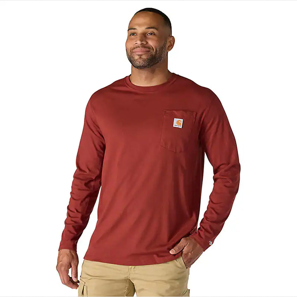 The hotter it is outside, the harder it is to stay focused. This men's Carhartt long-sleeve t-shirt is super-lightweight and airy, so you feel your best when the mercury rises. Made for the most demanding jobs, it also dries fast, fights odor, and features plenty of stretch. Reflective taping helps add visibility on days you're out before the sun.