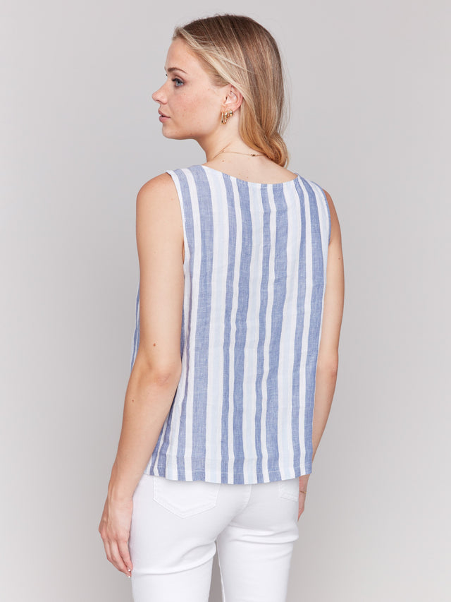 Printed Sleeveless Linen Blend Top with Slit - Stripes - C4543YR-229B