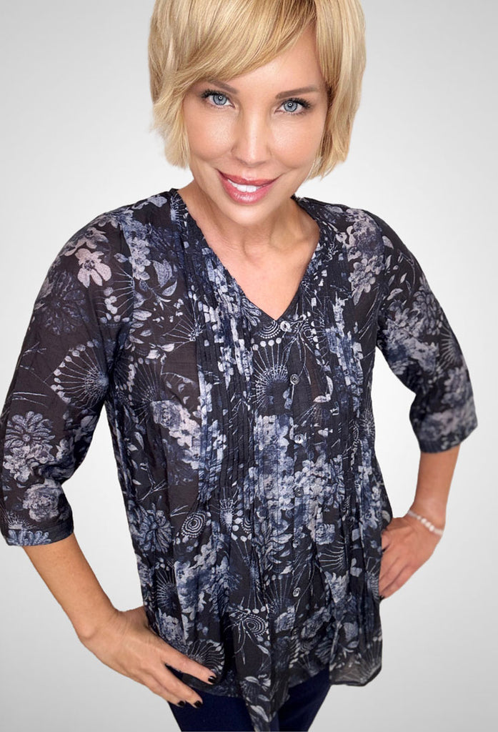 A relaxed fit accented by flattering v neckline and small buttons. Mid length cut gives coverage even with the most fitted of pants. Easy care material and lightweight enough to either layer or wear this stunning piece solo.