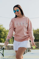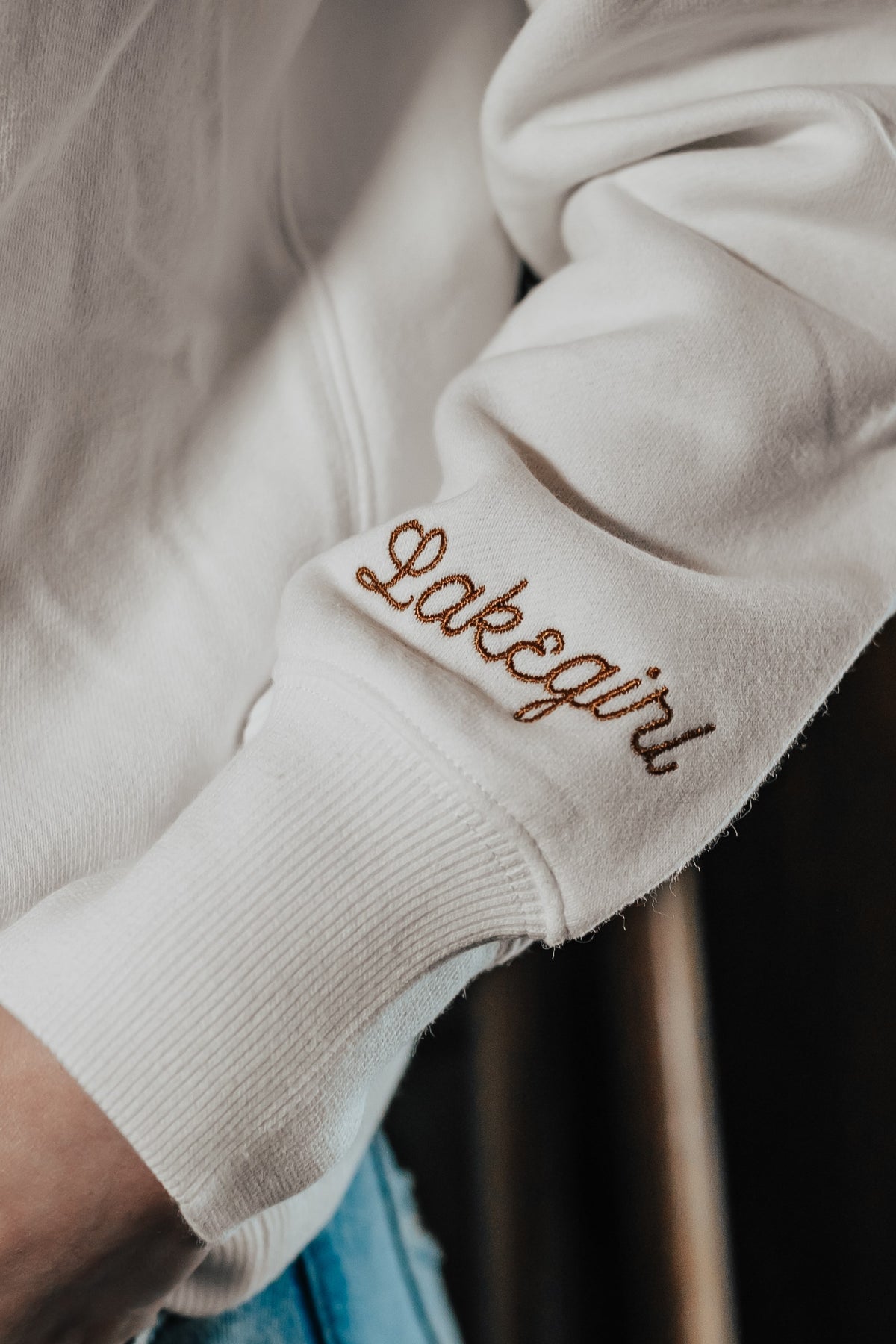 A classic fit version of our favorite sanded fleece crew neck. With longer cuffs and a classic fit, our Boyfriend Crew Neck goes well with jeans, leggings, or sweats. Features embroidered left cuff, back yoke, and front design.