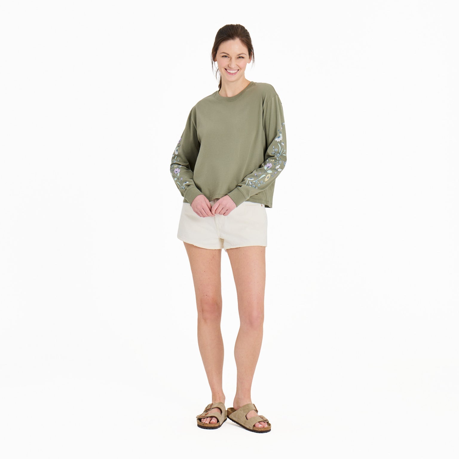 Women's Wildflowers and Bees Long Sleeve Crusher Boxy Tee - Moss Green - 139731