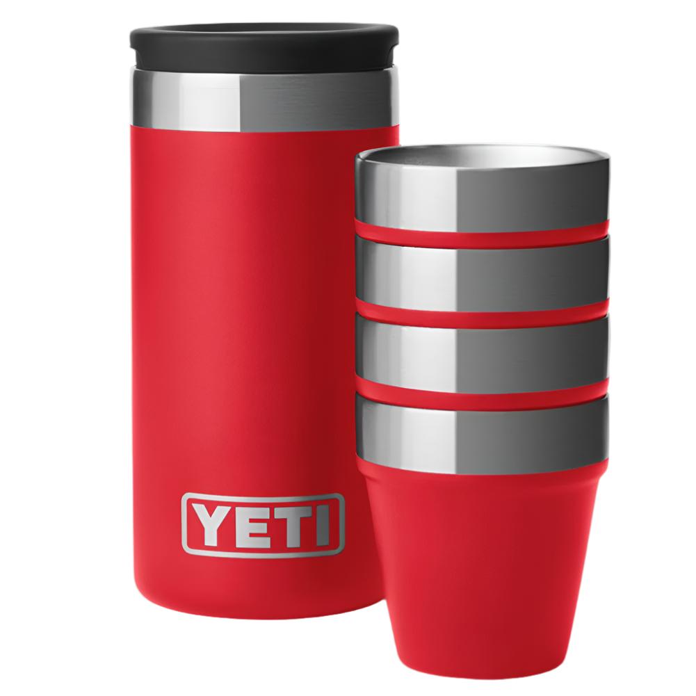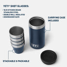 Stack, pack, and knock one back with the YETI Shot Glasses. Whether its a post-hunt toast or you just landed another in the boat, go bottoms up with the YETI Shot Glasses. Designed to stack and pack in a portable carrying container, four shot glasses are ready to deploy anytime you need to knock one back.