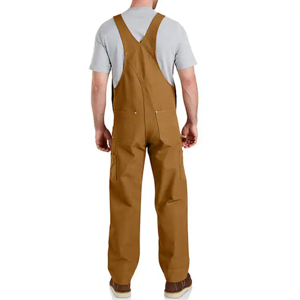 Relaxed Fit Duck Bib Overall, every detail, from the front-to-back kick panel on the cuffs to the extra stretch around the waist, was informed by the hardworking people who wear our gear day-in and day-out. Dependable and durable, the bibs are made with our heavyweight cotton duck. They have elastic suspenders, a double layer at the knees, and ample pockets.