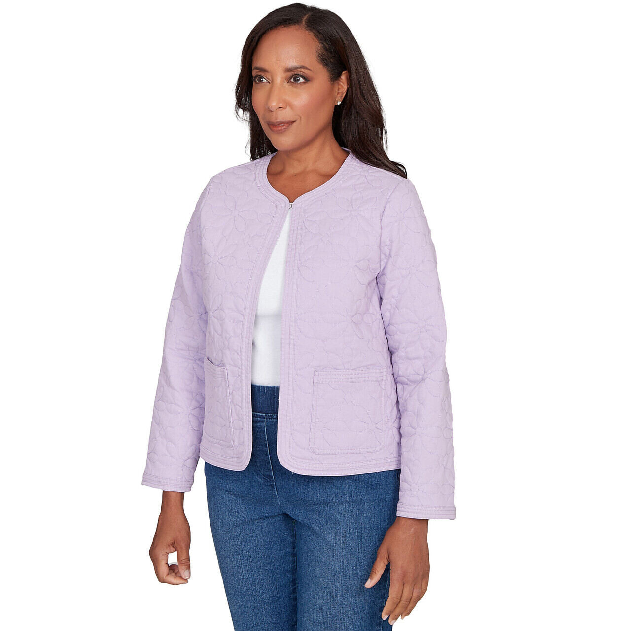 This cozy colored denim jacket features a quilted exterior and a charming floral patchwork lining for a hidden pop of personality. Styled with a soft crew neckline, hook and eye neck closure, long sleeves, front pockets, and a relaxed straight hem, it's a warm, whimsical layer made for cooler days.