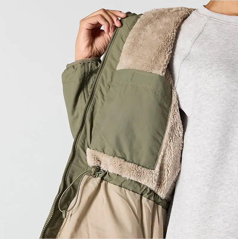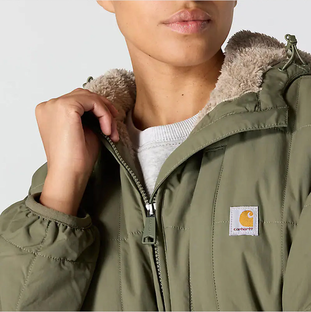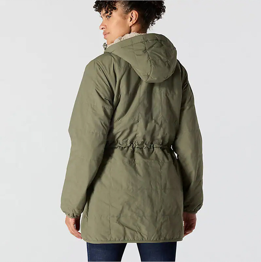 This hooded sherpa-lined women's coat is insulated for warmth and made to repel light rain. Sherpa fleece in the hood and upper body adds comfort while you work, and a vented side hem provides airflow. The loose fit is easy to layer and gives you plenty of room to move.