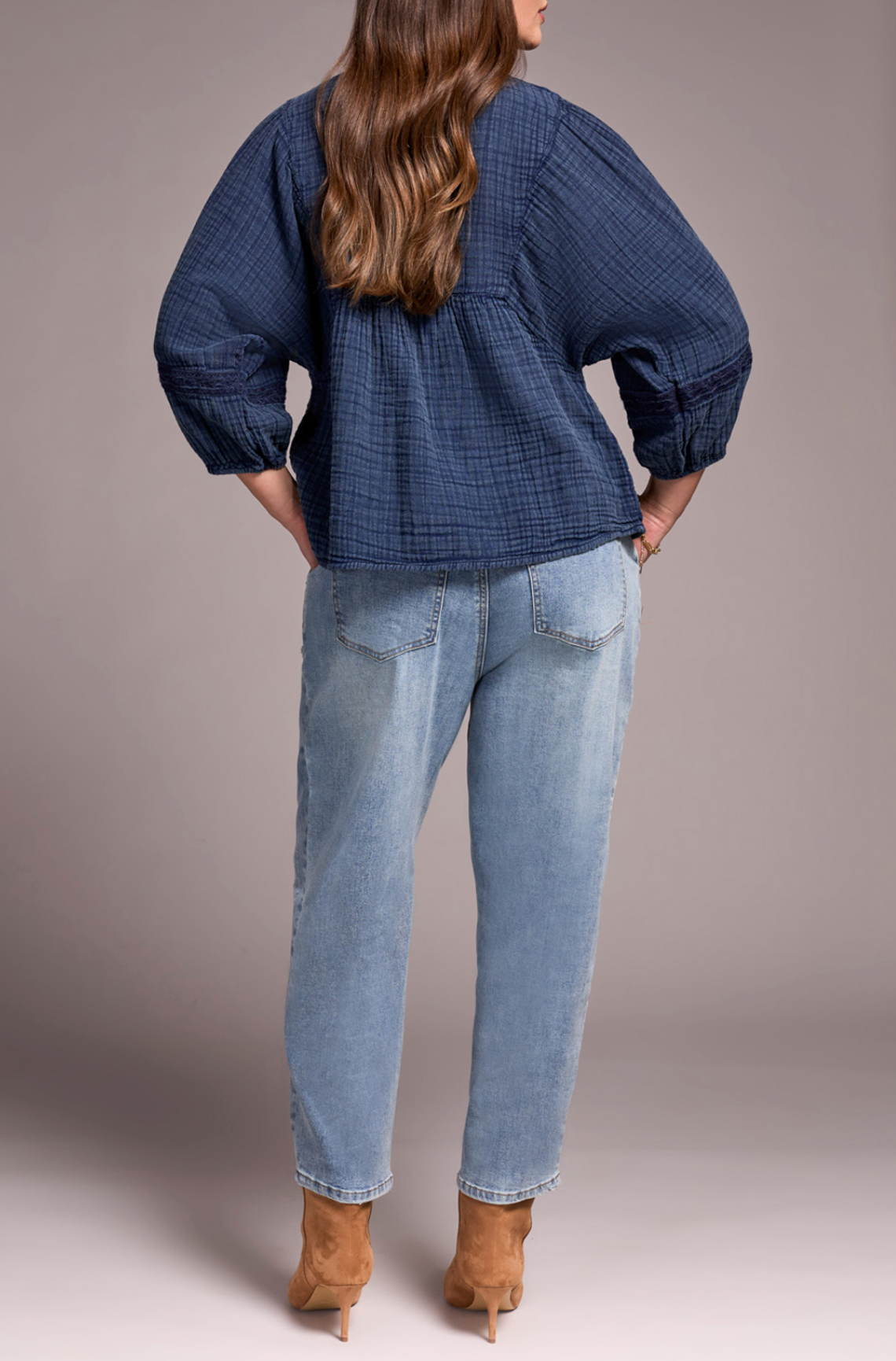 Elbow Sleeve Button Front Blouse W/Tape Detail-Deep Sea