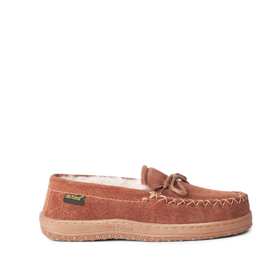 The Old Friend Women's Loafer n features distinctive stitching and cinch-tie with 100% sheepskin insoles. The raised toe provides extra toe freedom for improved comfort.  Available in women's sizes 5-12, wide width sizes 5-12.