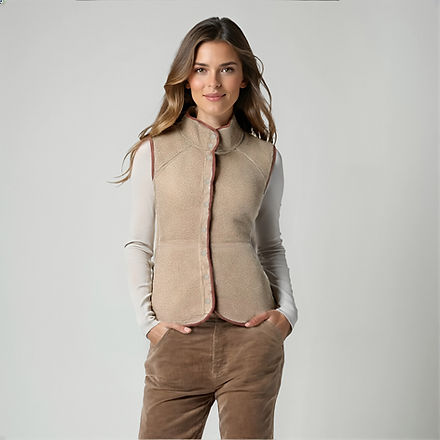 A Women's beige-colored vest with a brown collar. The vest appears to be made of a Pine Peak Short soft, textured fabric, overall design is simple and casual.
