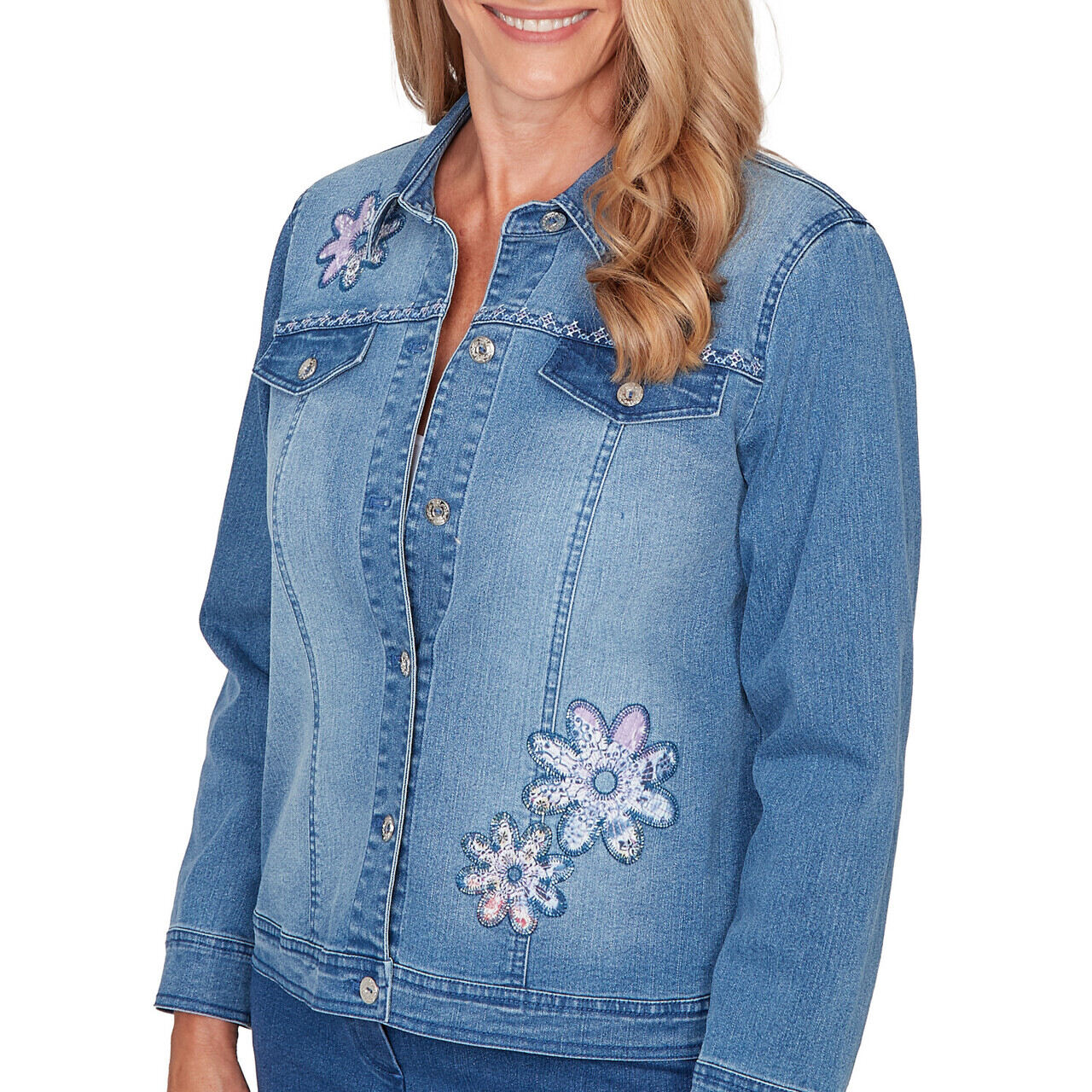 Delicate floral applique blooms across this light denim jacket, adding charm to a timeless silhouette. Designed with a pointed collar, button front, long sleeves, and faux chest pockets, it finishes with a straight hem and artistic softness.