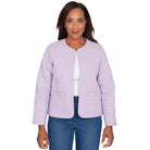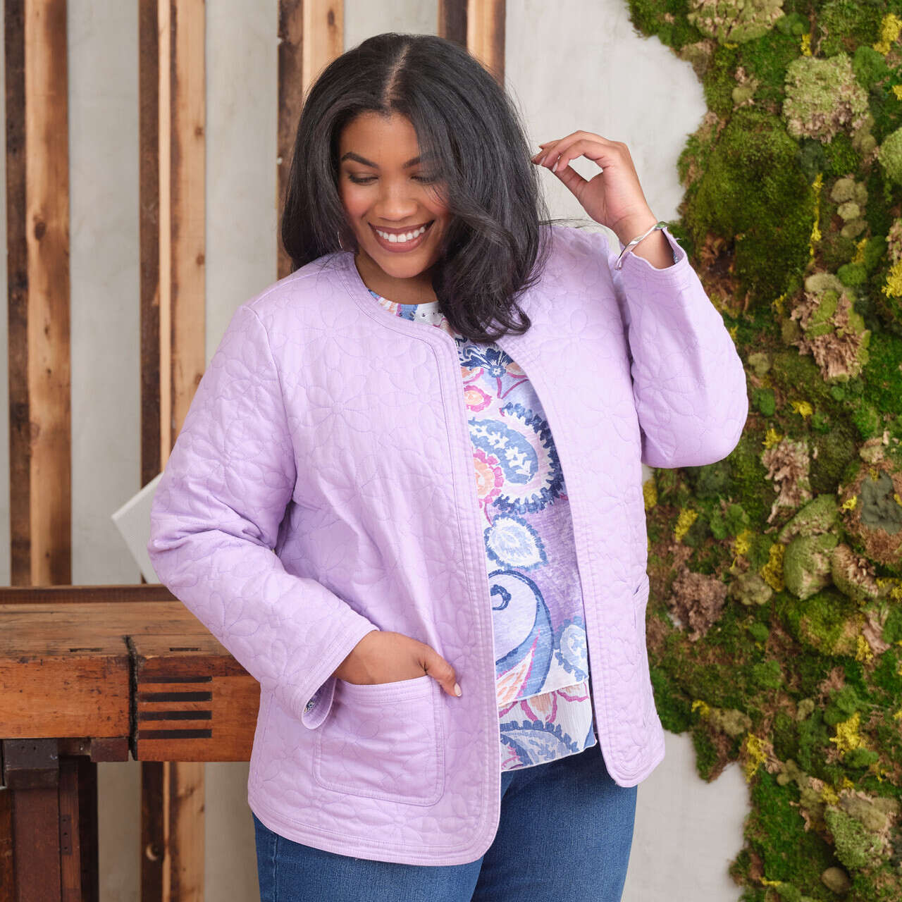 This cozy colored denim jacket features a quilted exterior and a charming floral patchwork lining for a hidden pop of personality. Styled with a soft crew neckline, hook and eye neck closure, long sleeves, front pockets, and a relaxed straight hem, it's a warm, whimsical layer made for cooler days.