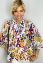 This blouse will have you asking, "where's the party?". After all who doesn't want to be seen wearing this vibrant pattern and flattering airy blouse. A warm weather, style winner.