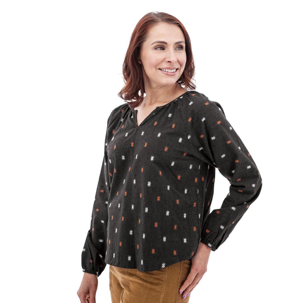 How much good can the Chelsi Peasant Top do? A lot! Every ounce of this top is eco-friendly and ethical. A blend of four fibers (organic cotton, recycled cotton, recycled polyester, and hemp) reduce emissions and harm to the environment while delivering incredible benefits. Cotton and hemp are lovely natural materials that breathe well while recycled polyester allows for that gorgeous durability. Not only is it better for the environment, it's also Fair Trade Certified™ ensuring fair treatment and pay for garment workers. The design is cute and feminine, featuring raglan sleeves (so much extra room around the arms!) ruching along the collar and cuff, and a peasant-style neckline.