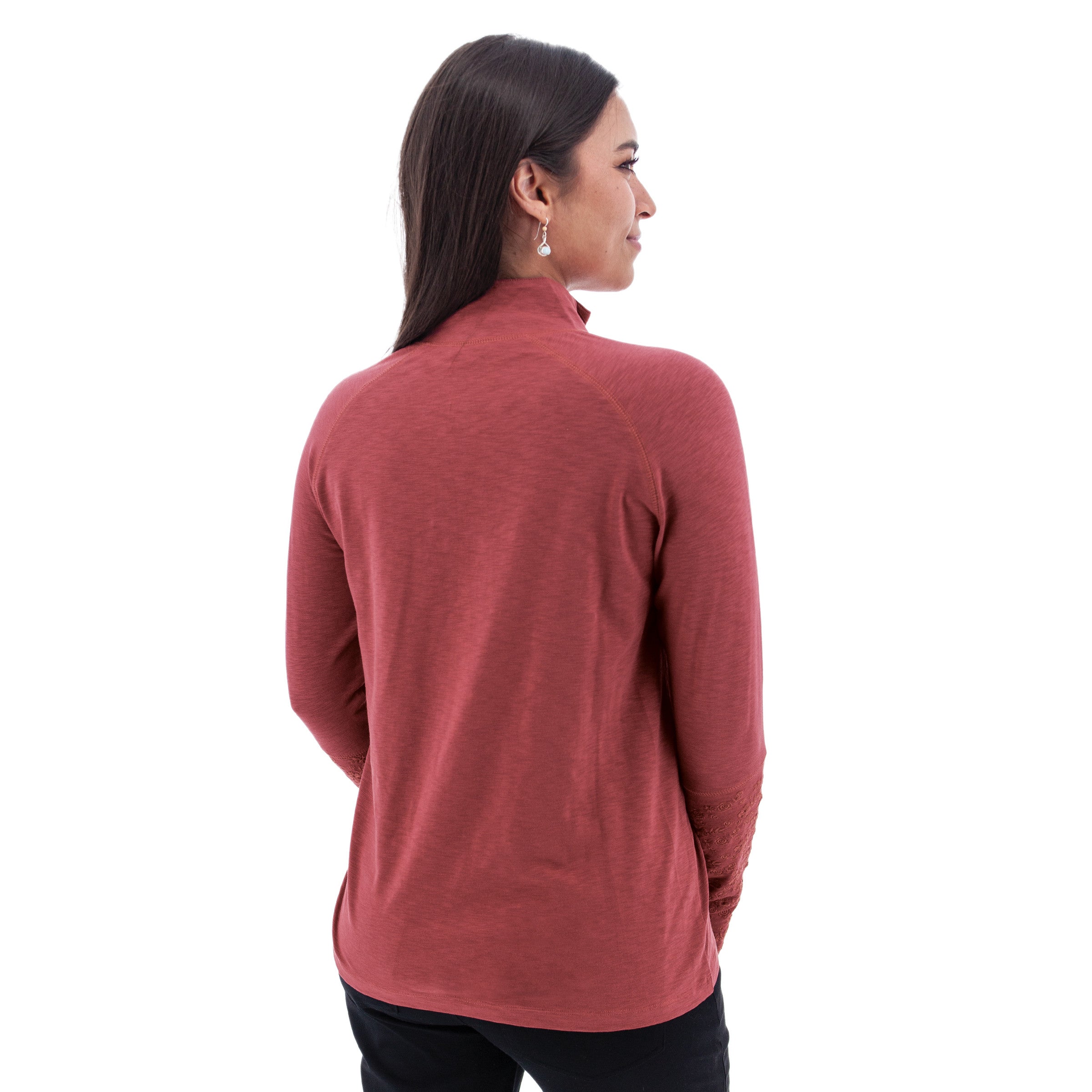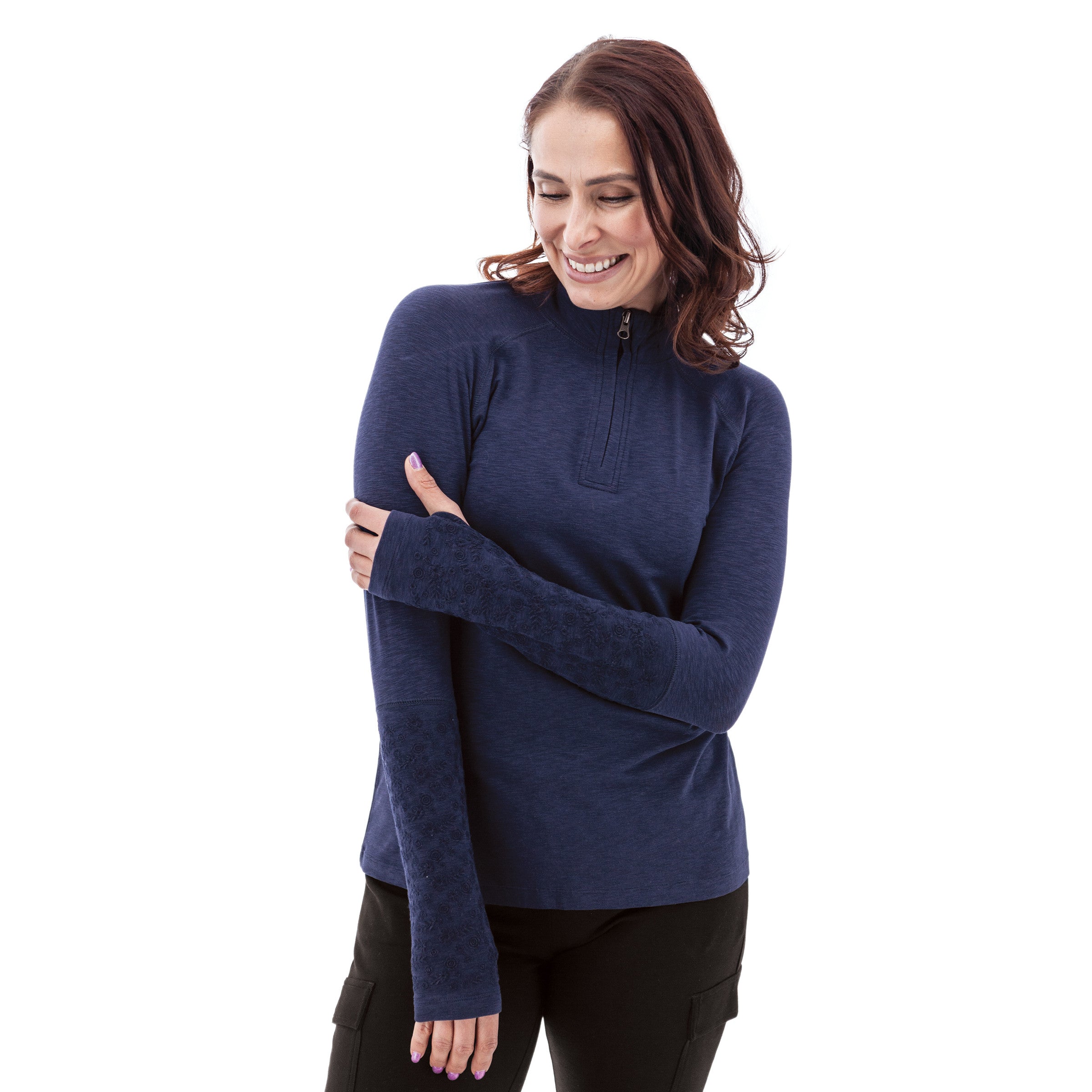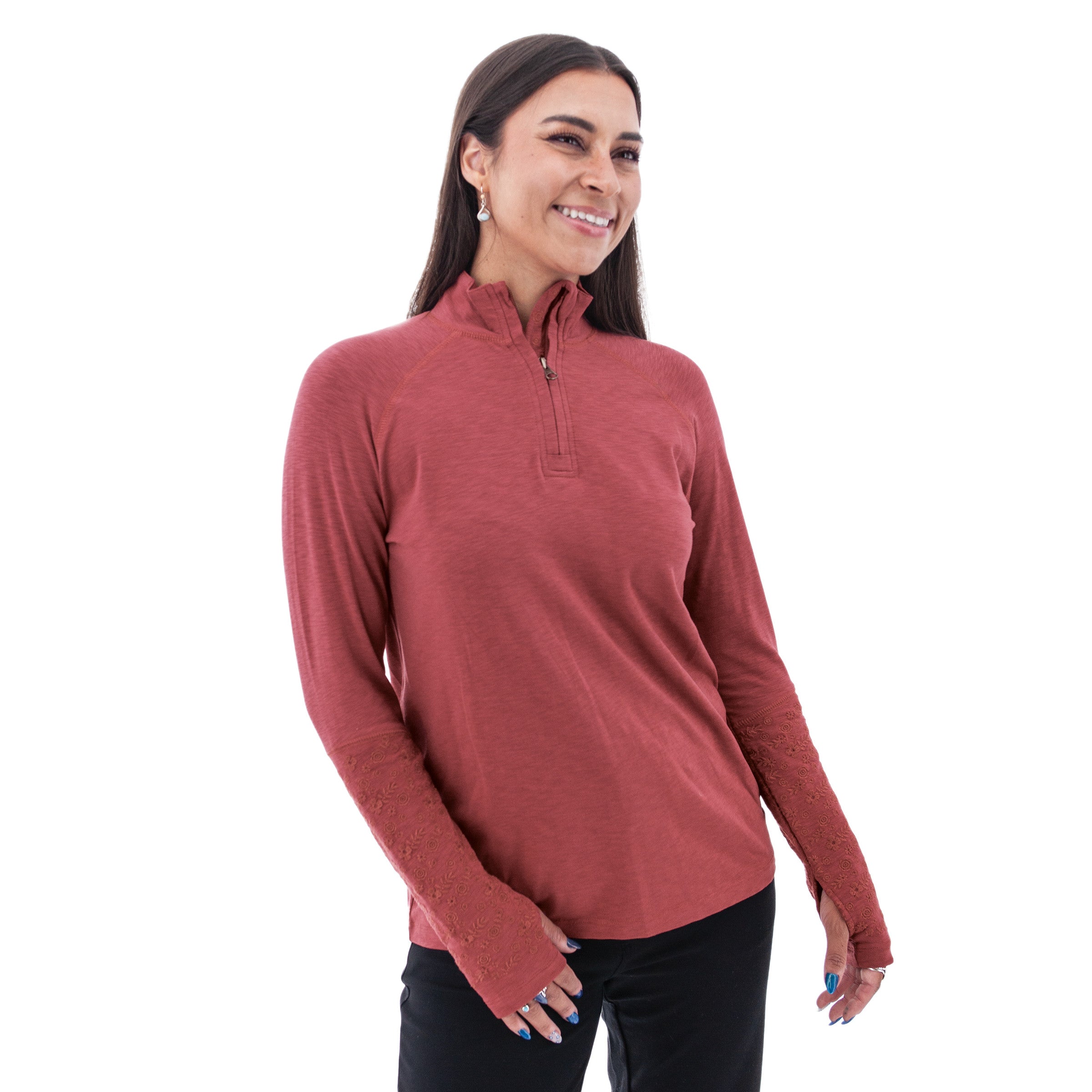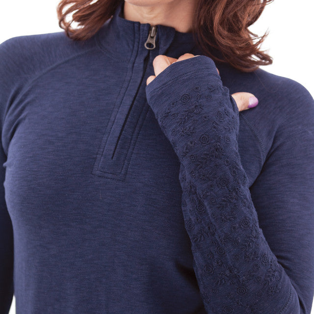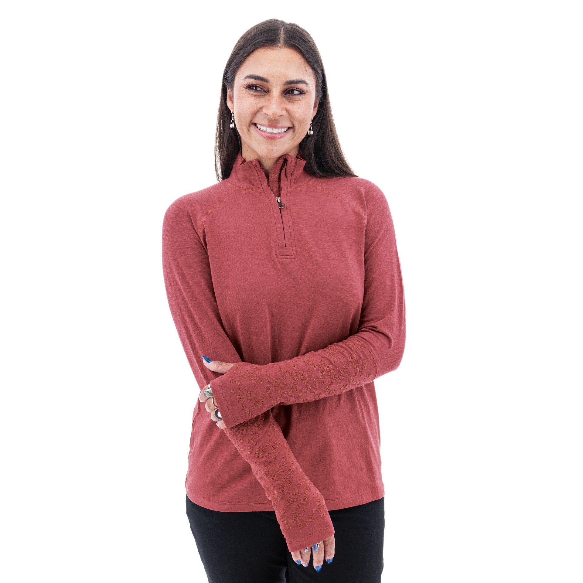 The McIntyre 1/4 Zip Embroidered Pullover is more than meets the eye...and with its beautiful design that's saying a lot! We love the sleek, almost invisible look of the zipper placket when fully zipped as well as the embroidery detail that pops when unzipped. This embroidery mimics the embroidery along the sleeves. More than these attractive details, we love that raglan sleeves add greater room and comfort around the arms. And this shirt is all about comfort! This athleisure style is made to look good and to keep up with the busiest of days. You can see this with the thumb holes and the beautiful fabric ?? a sustainable blend of organic cotton and TENCEL™ Lyocell with a kiss of spandex.