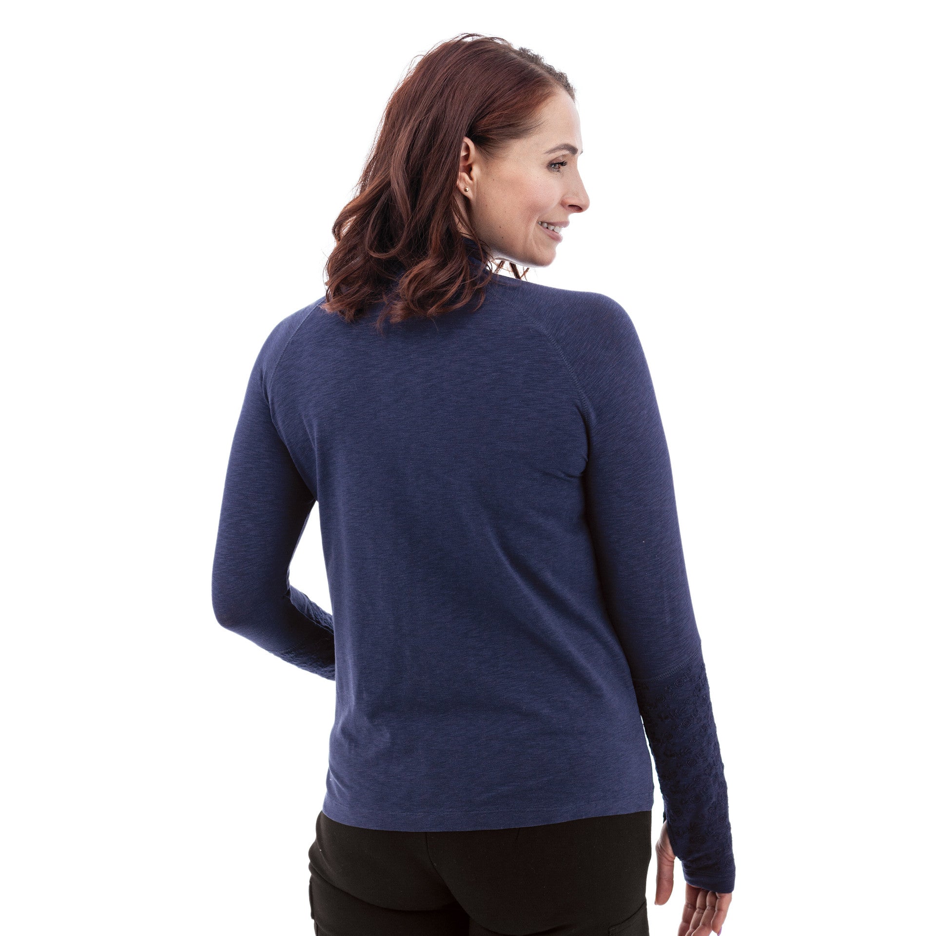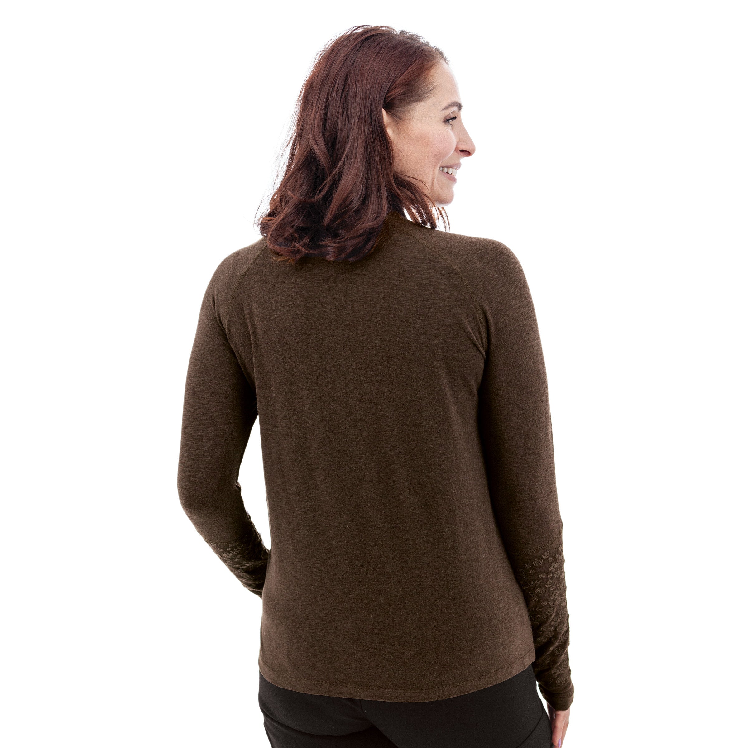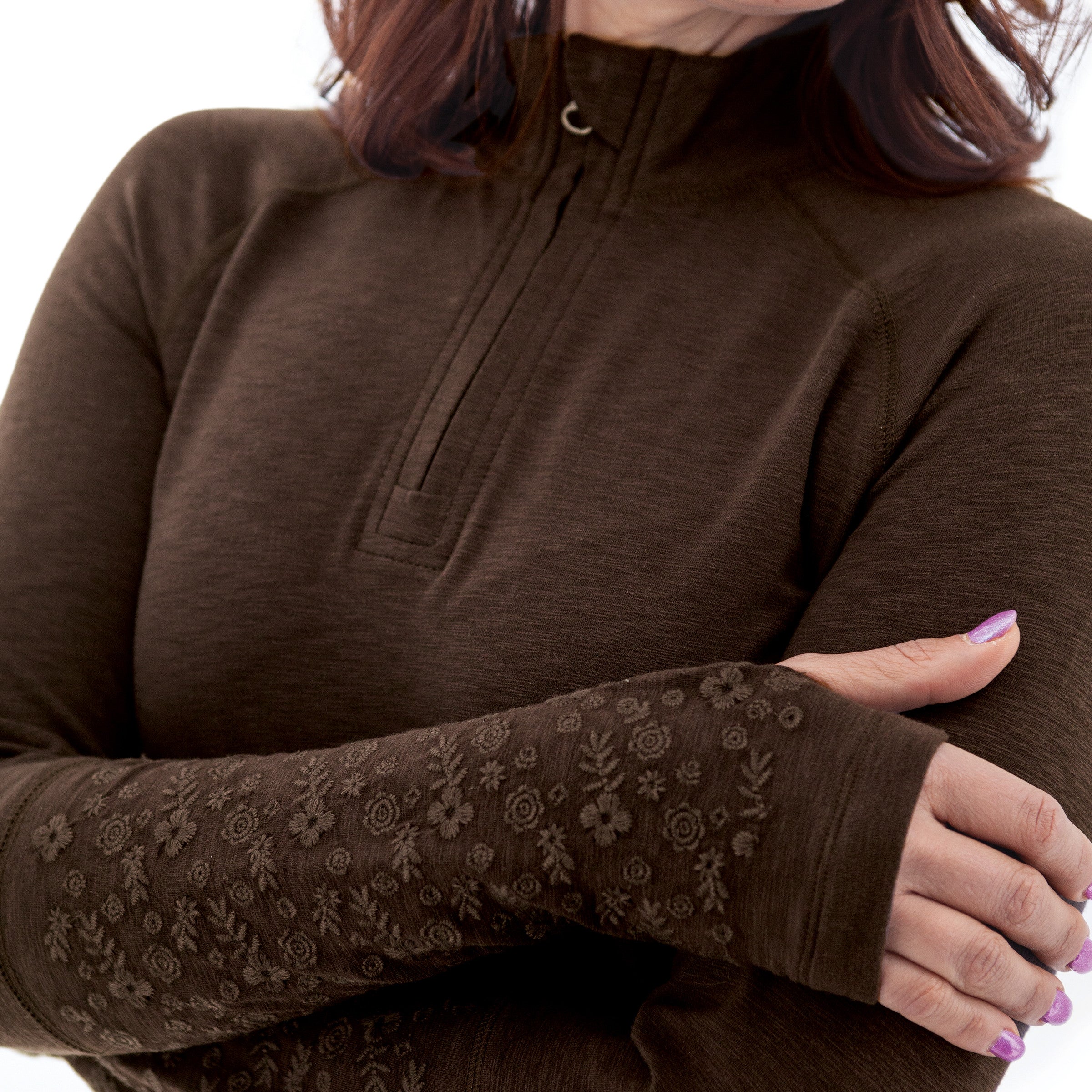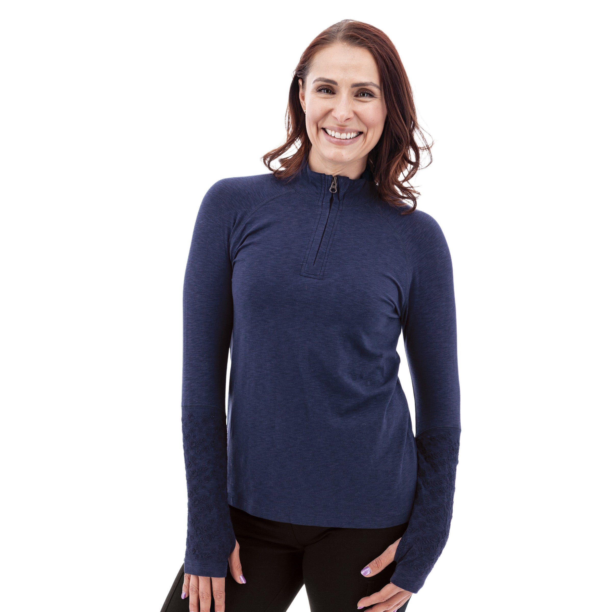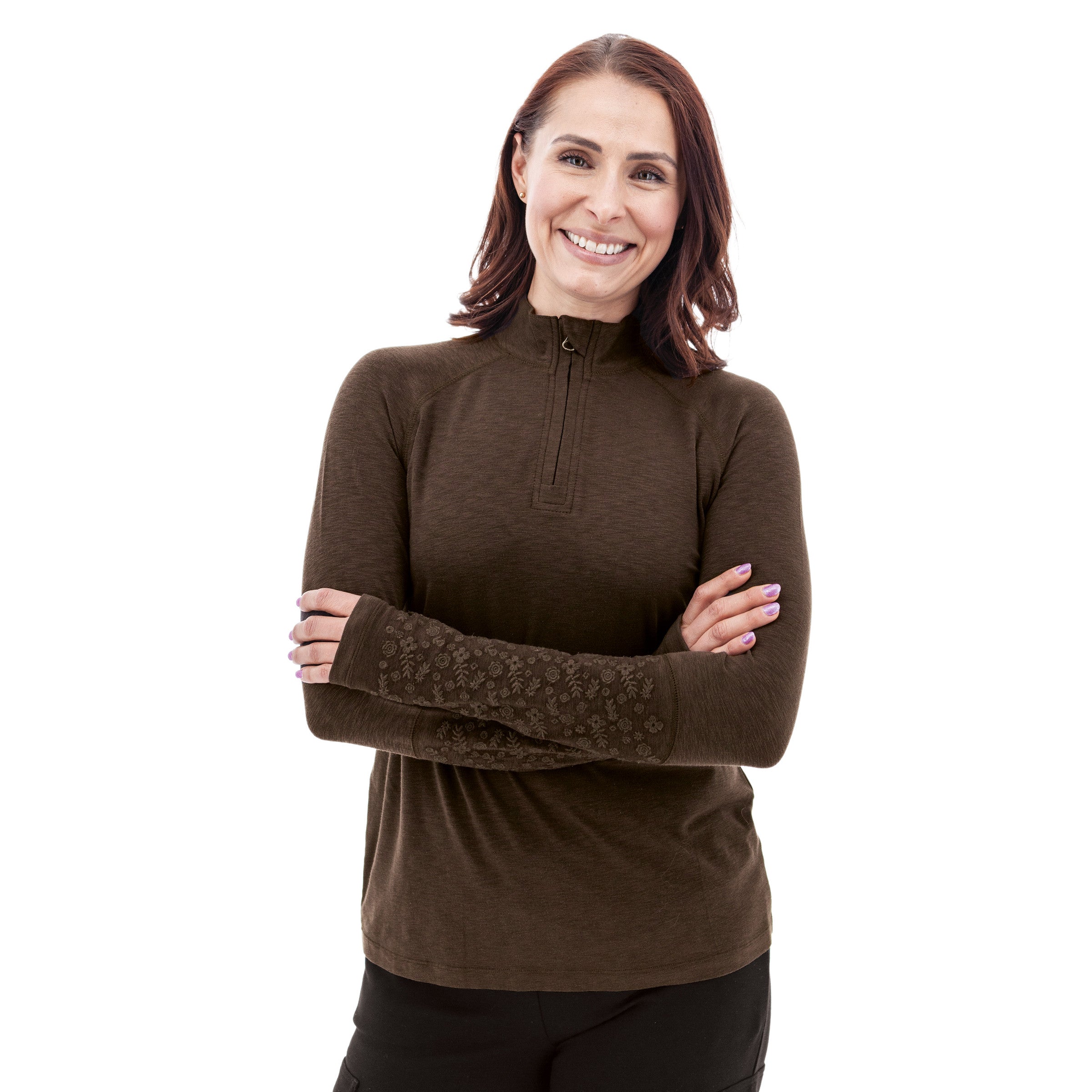 The McIntyre 1/4 Zip Embroidered Pullover is more than meets the eye...and with its beautiful design that's saying a lot! We love the sleek, almost invisible look of the zipper placket when fully zipped as well as the embroidery detail that pops when unzipped. This embroidery mimics the embroidery along the sleeves. More than these attractive details, we love that raglan sleeves add greater room and comfort around the arms. And this shirt is all about comfort! This athleisure style is made to look good and to keep up with the busiest of days. You can see this with the thumb holes and the beautiful fabric ?? a sustainable blend of organic cotton and TENCEL™ Lyocell with a kiss of spandex.