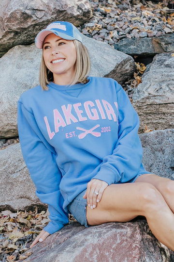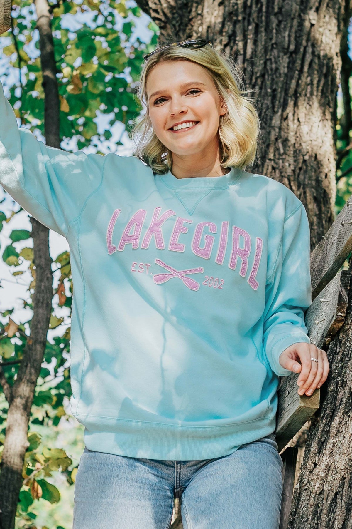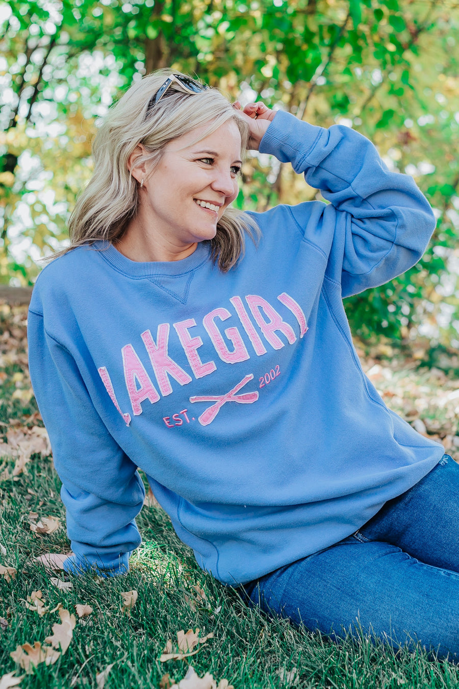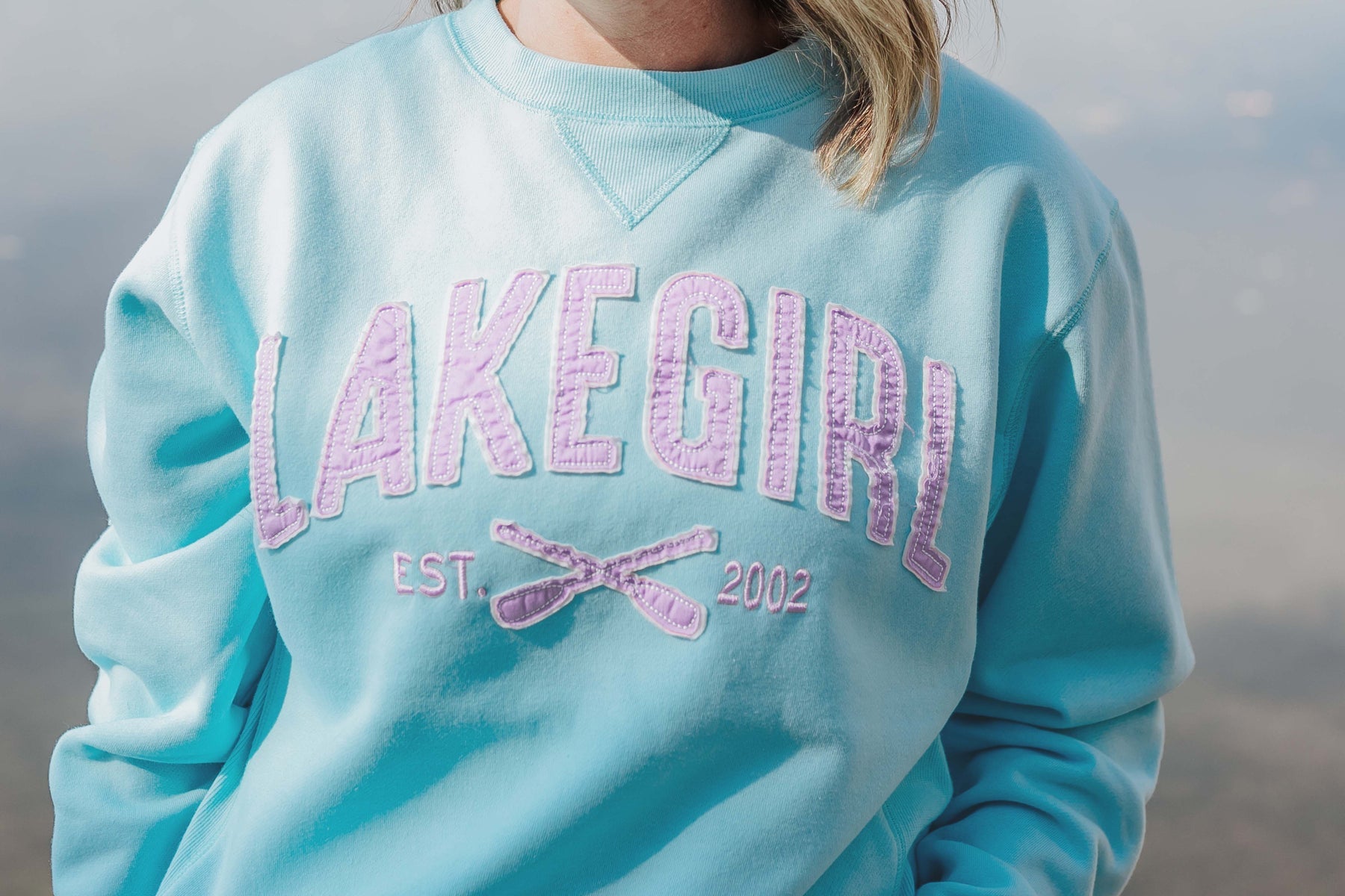 You're going to love this new color combo on our classic sanded fleece crew! Features a wisteria applique logo on a surf sanded fleece crew neck.