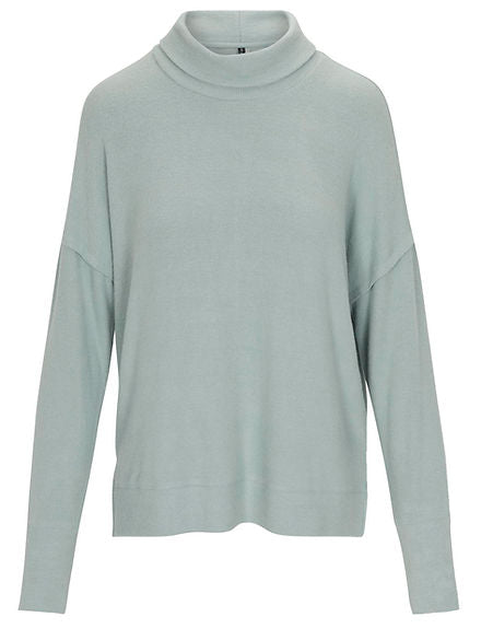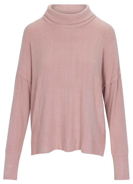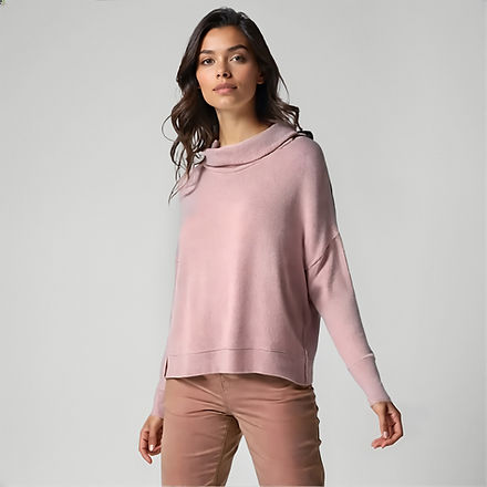 The sweater has a mock neckline and long sleeves. The fabric appears to be Super Soft Neck and comfortable, with a ribbed texture, giving the sweater a relaxed and casual look.