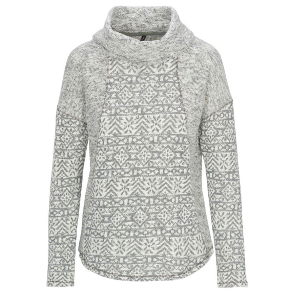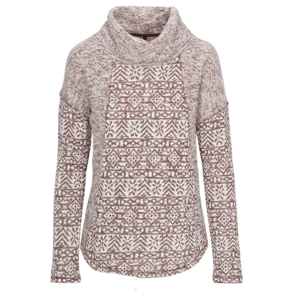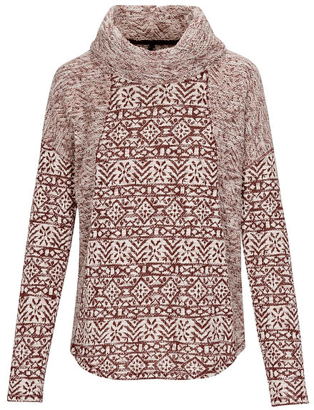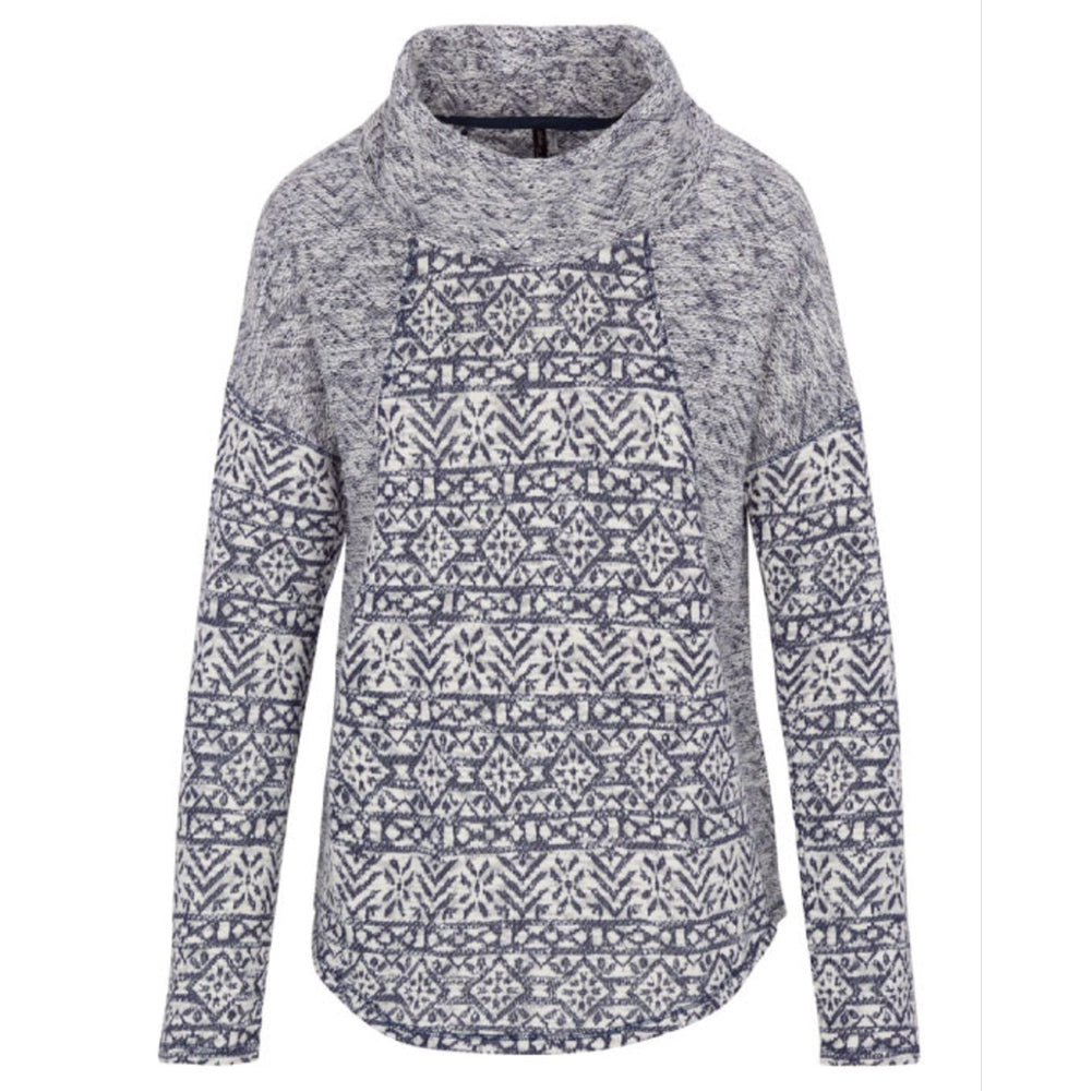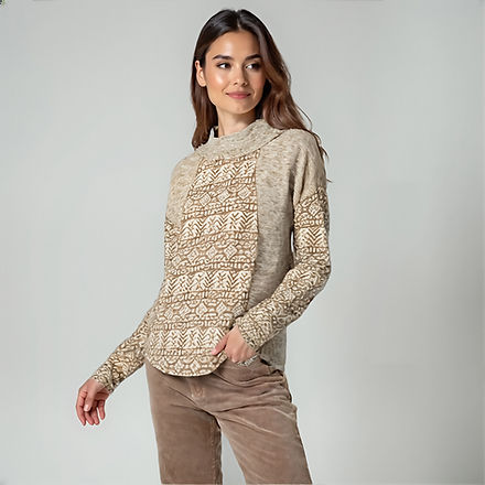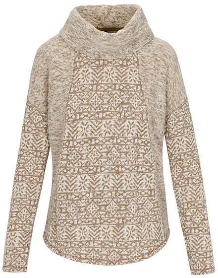 Women's long-sleeved top with a high neckline, Weston Cowl Neck fuzzy material and has a beige color with a geometric pattern. The pattern is made up of small, repeating geometric shapes.