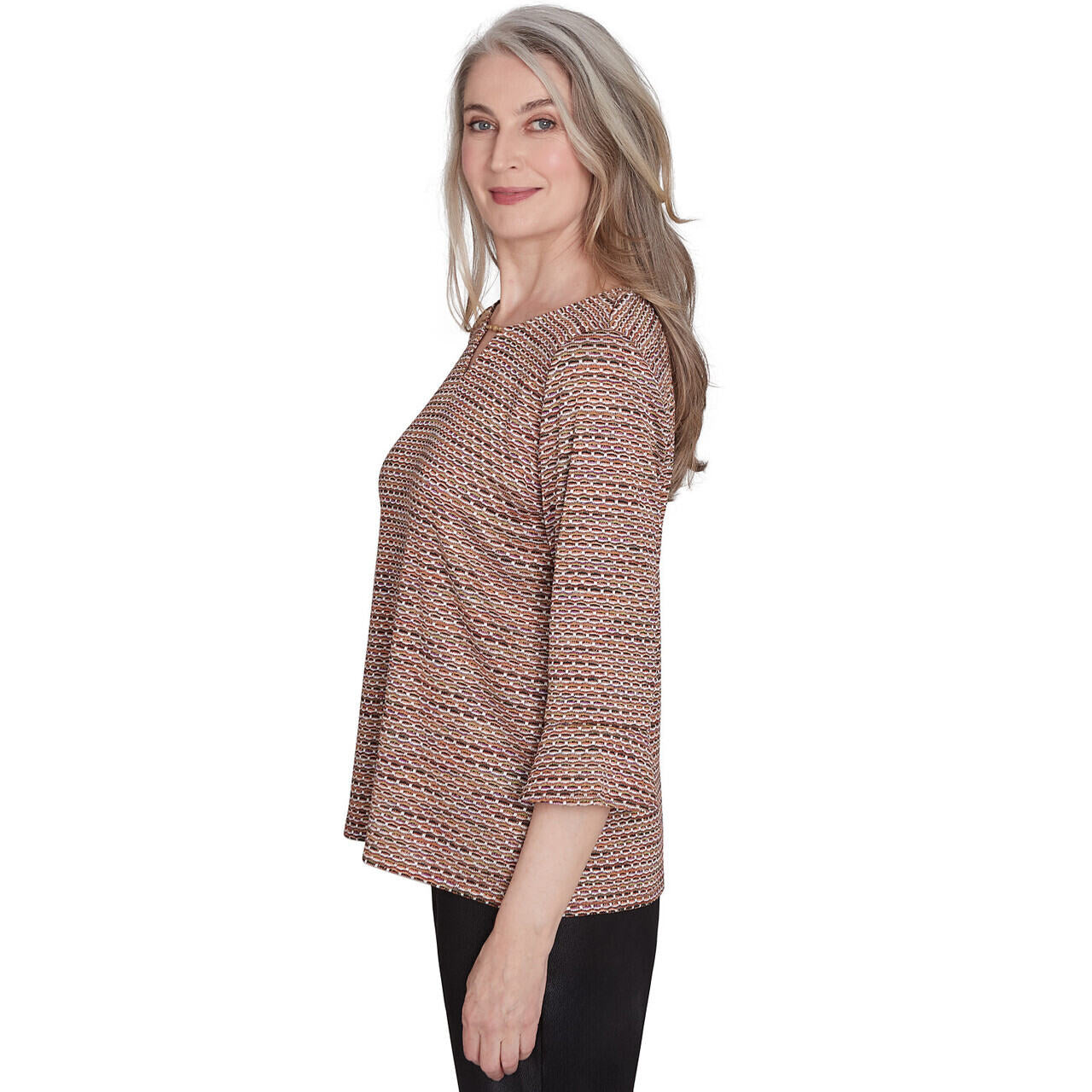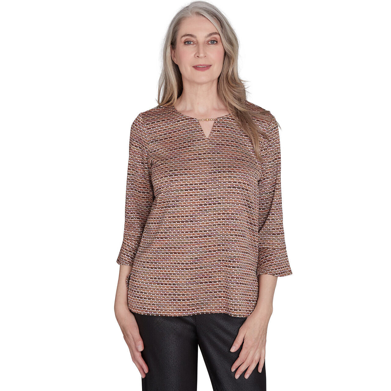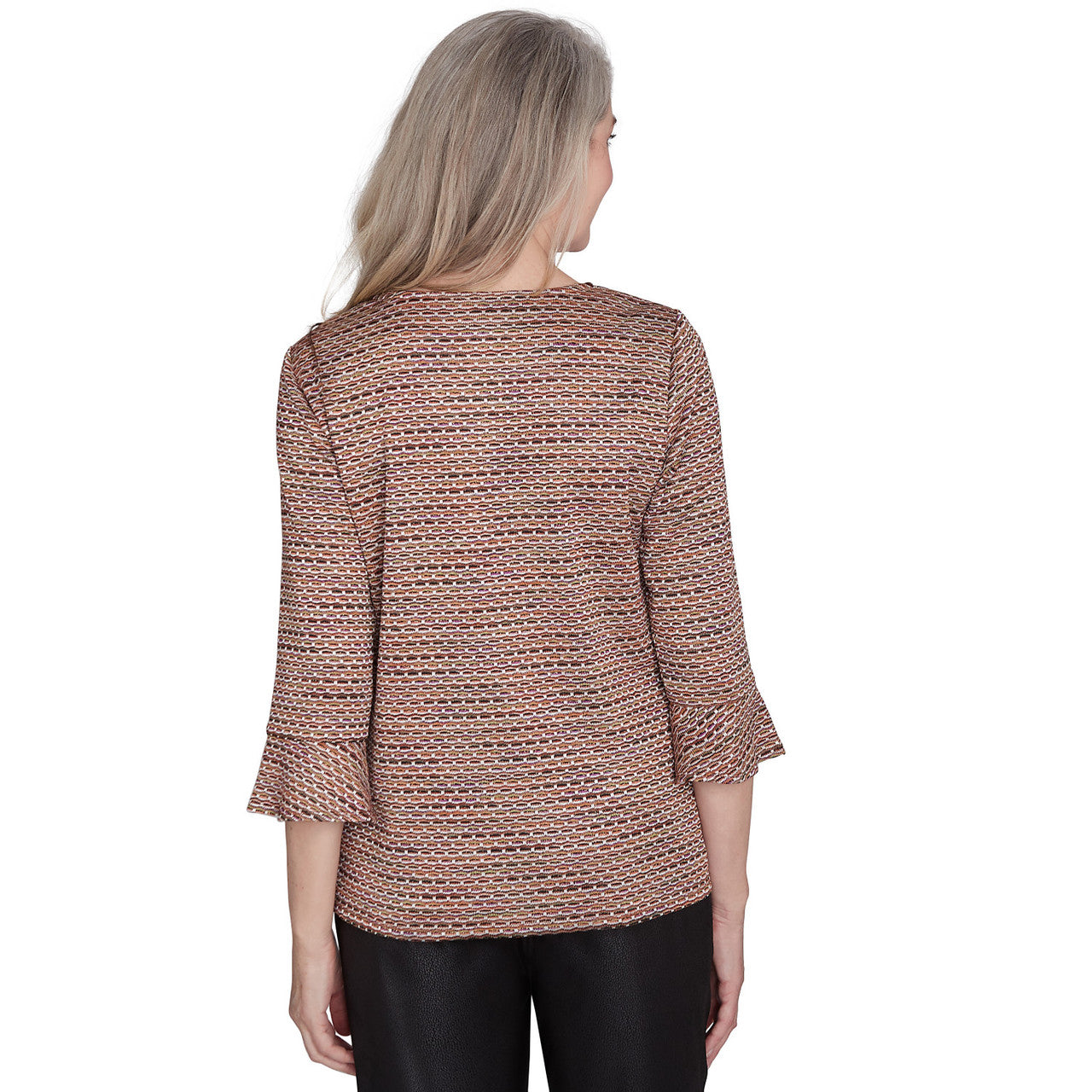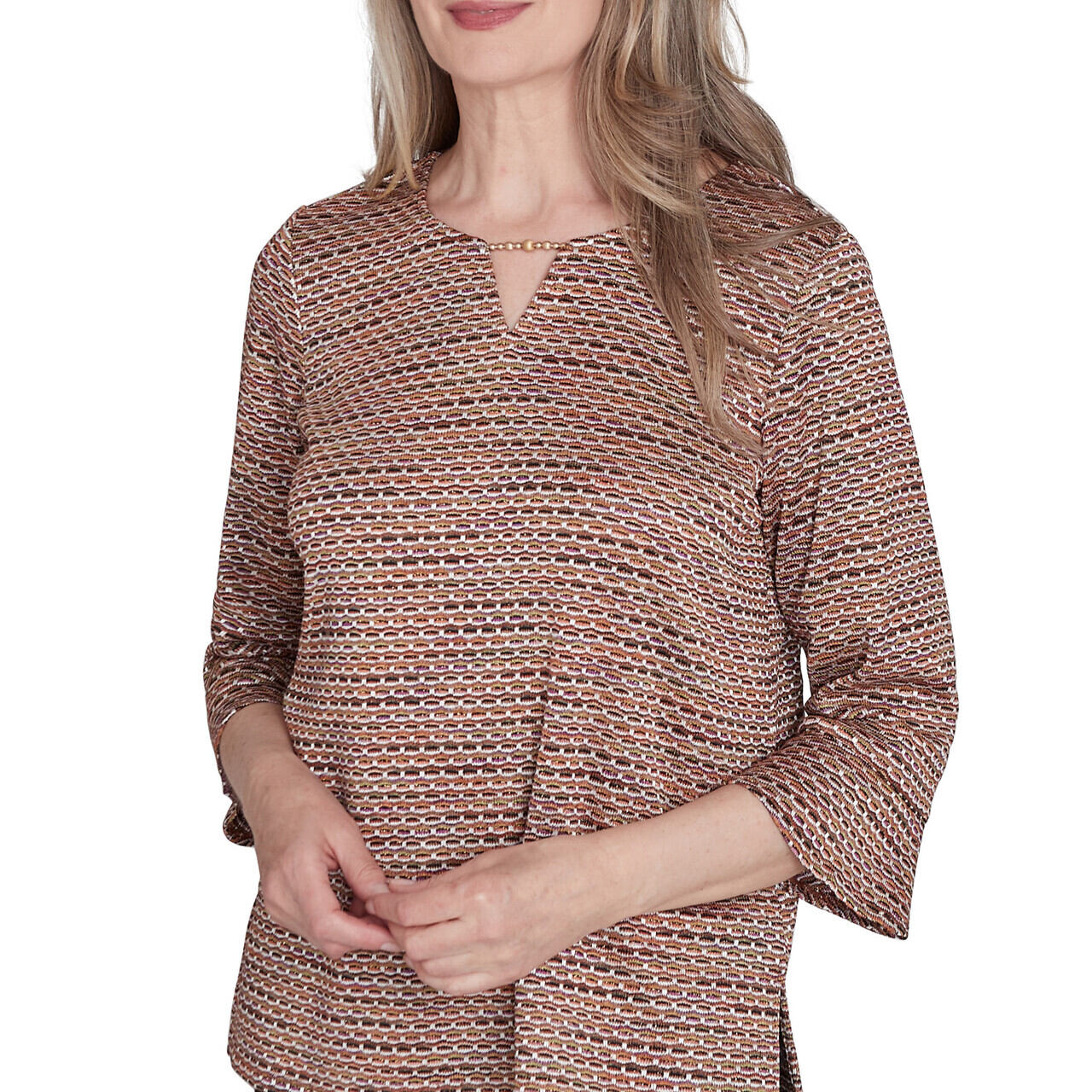 Embrace cozy elegance with our textured space dye woven top. Adorned with a beaded split neckline and bell three-quarter sleeves, it's perfect for fall. With its sleek straight hemline, it effortlessly combines style and warmth for the season.