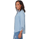 This soft woven Tencel(TM) shirt nods to artisan detail with contrast blanket stitching along the collar and placket. Slightly pleated shoulders and three quarter sleeves with tie cuffs add a feminine touch, while the button front and rounded hem offer laid-back structure perfect for crisp autumn days.