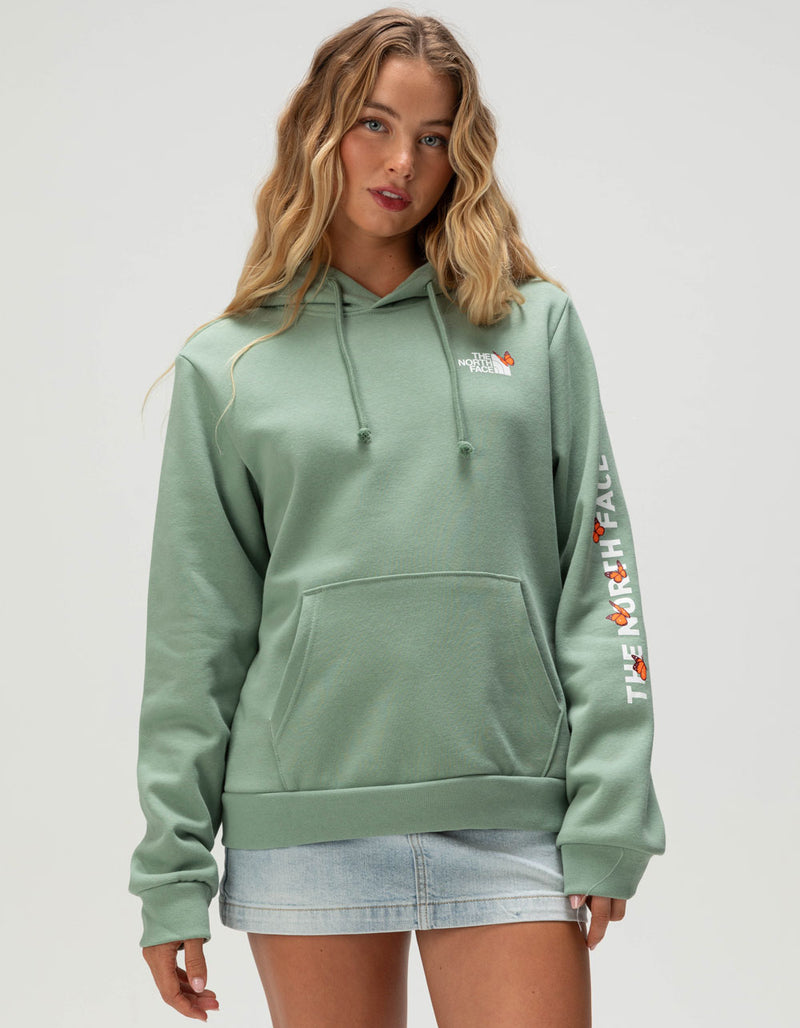The North Face Evolution Butterfly Hoodie. Logo with butterfly screened at left chest. Logo screened at back right shoulder. Front pouch pocket. Fixed hood. Fleece lining. Cuffed long sleeves and hem. 67% Cotton 33% Polyester. Machine wash. Imported.
