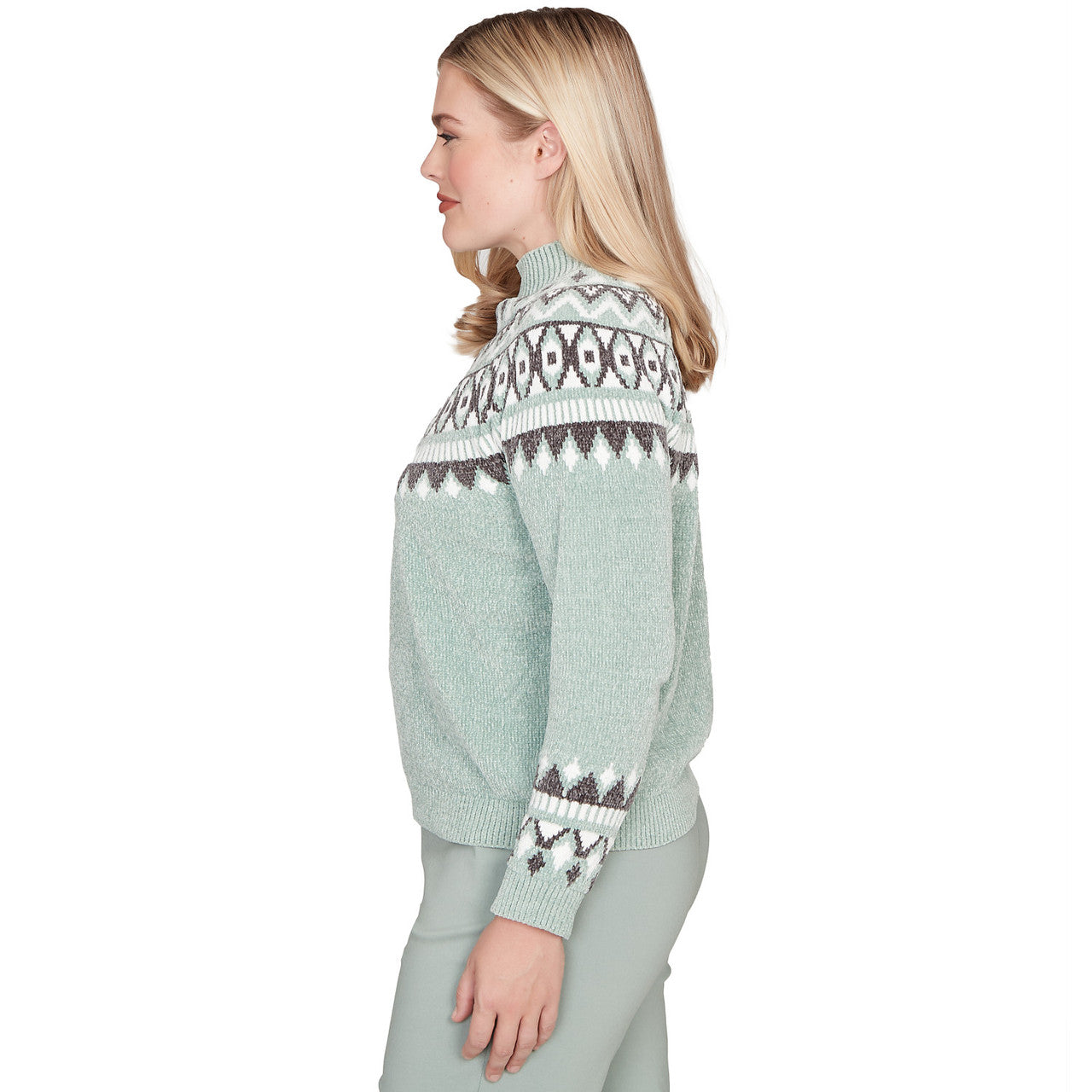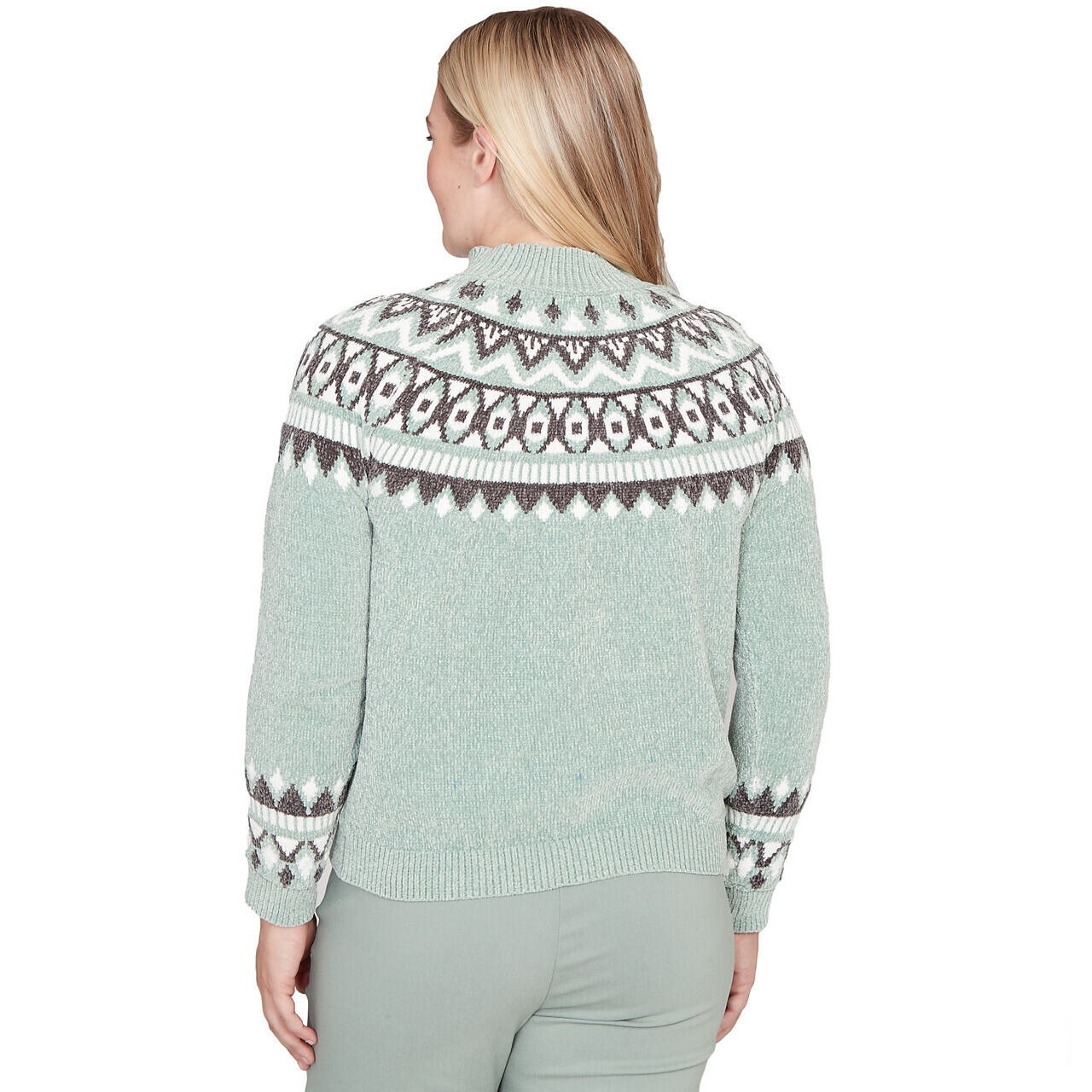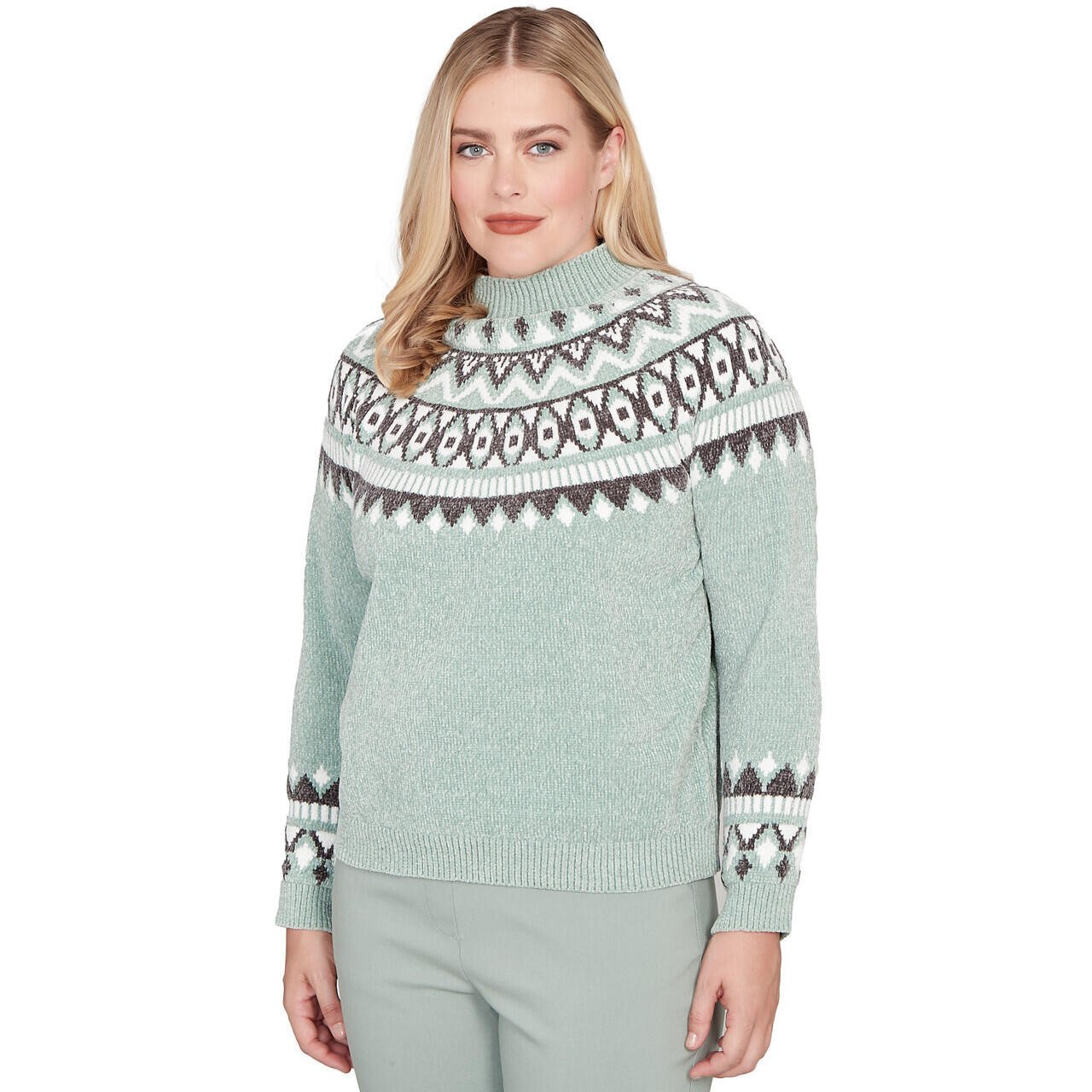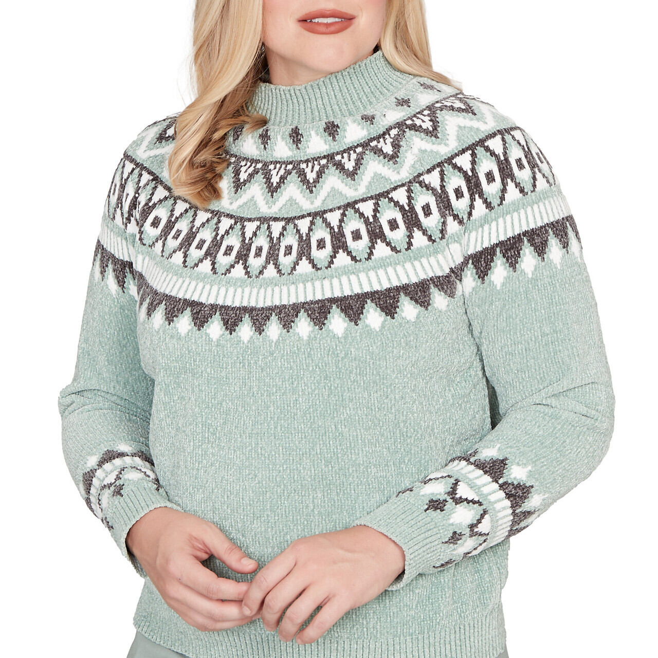 Sweater with classic winter charm, this Fair Isle chenille features a yoke design in soft sage hues. Plush to the touch, it's styled with a funnel neckline, long sleeves, and a relaxed hem for a cozy, heritage-inspired finish.