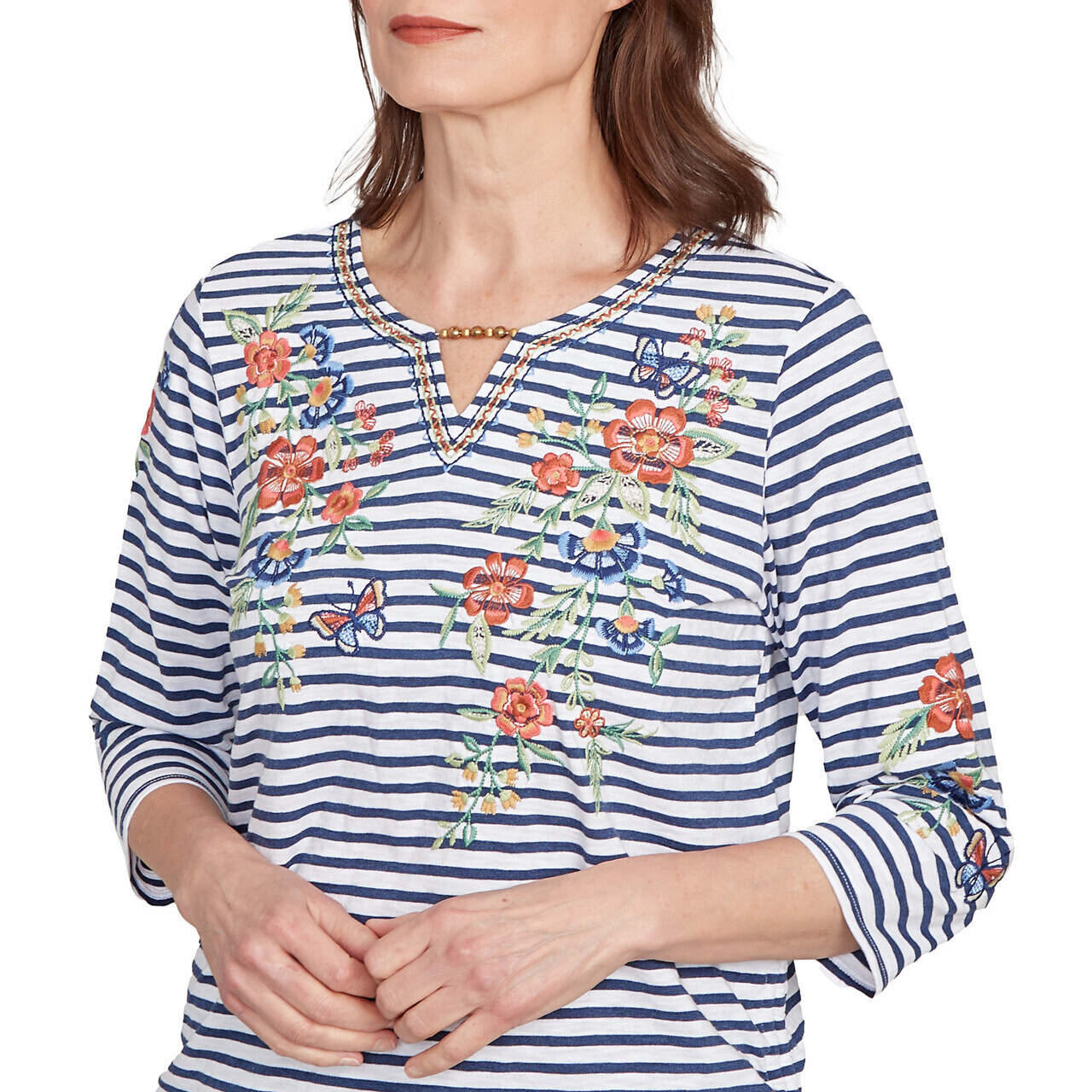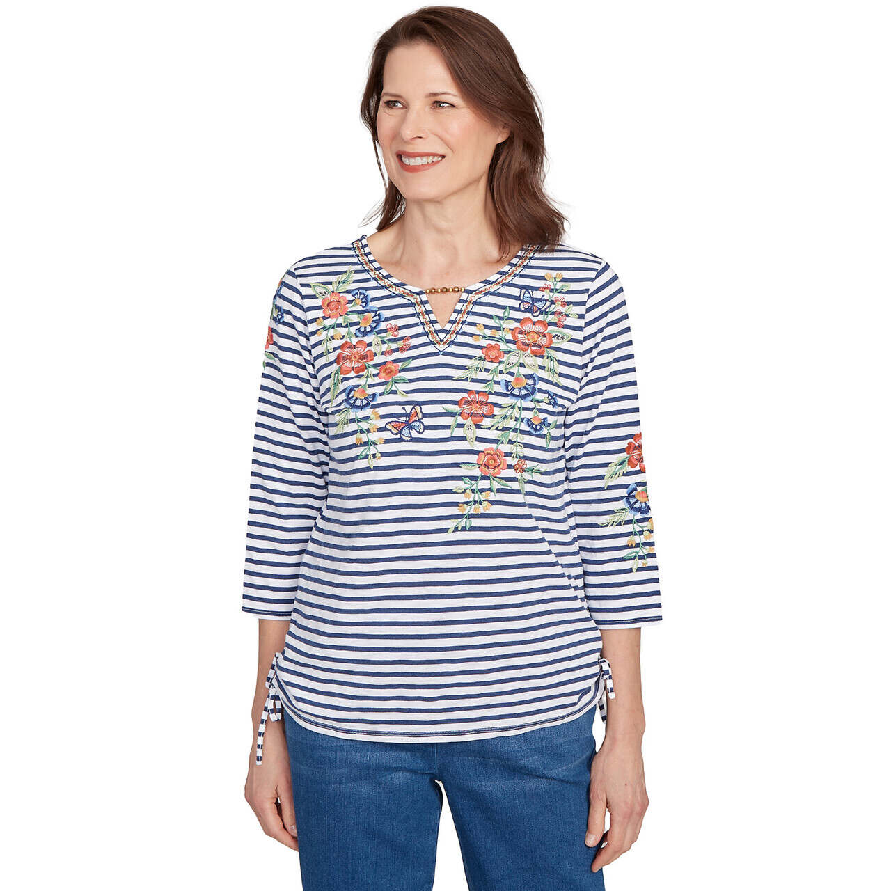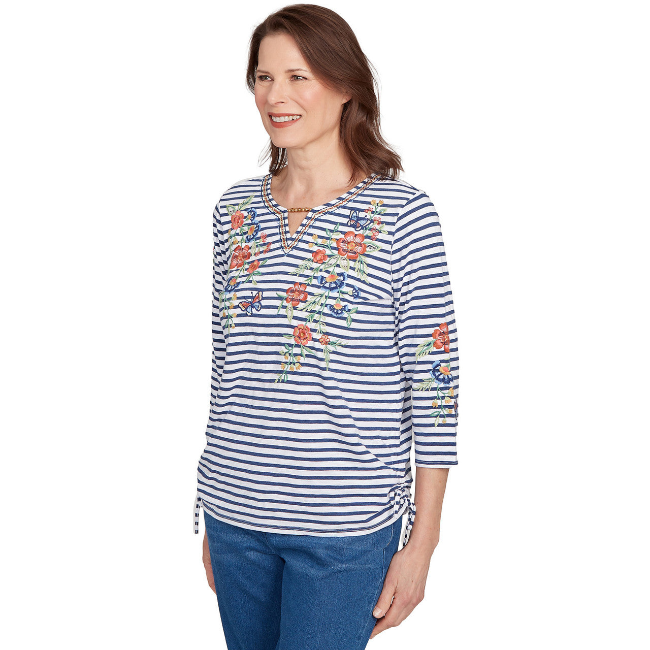 This striped top features a delicate floral neckline with a split detail, adding a touch of elegance. The three-quarter sleeves and straight hemline offer a flattering fit, while the double tie drawstring closures provide an extra stylish flair.