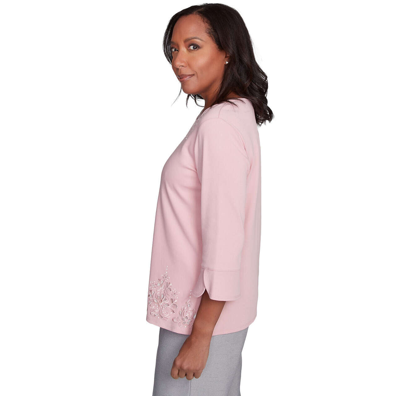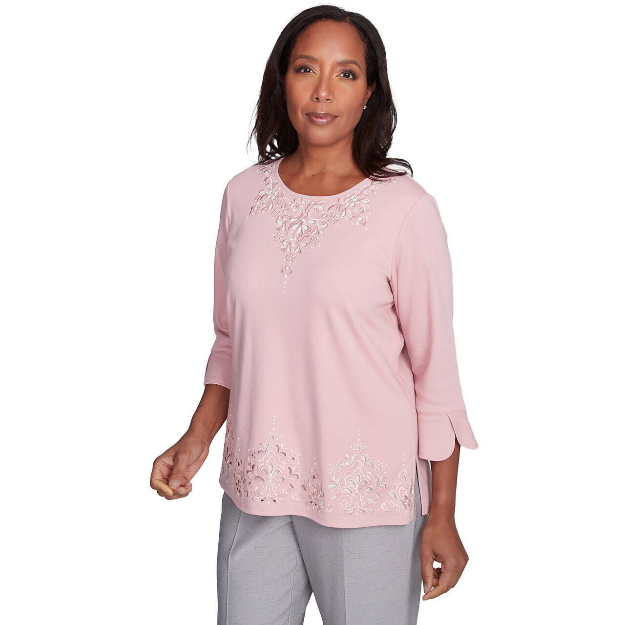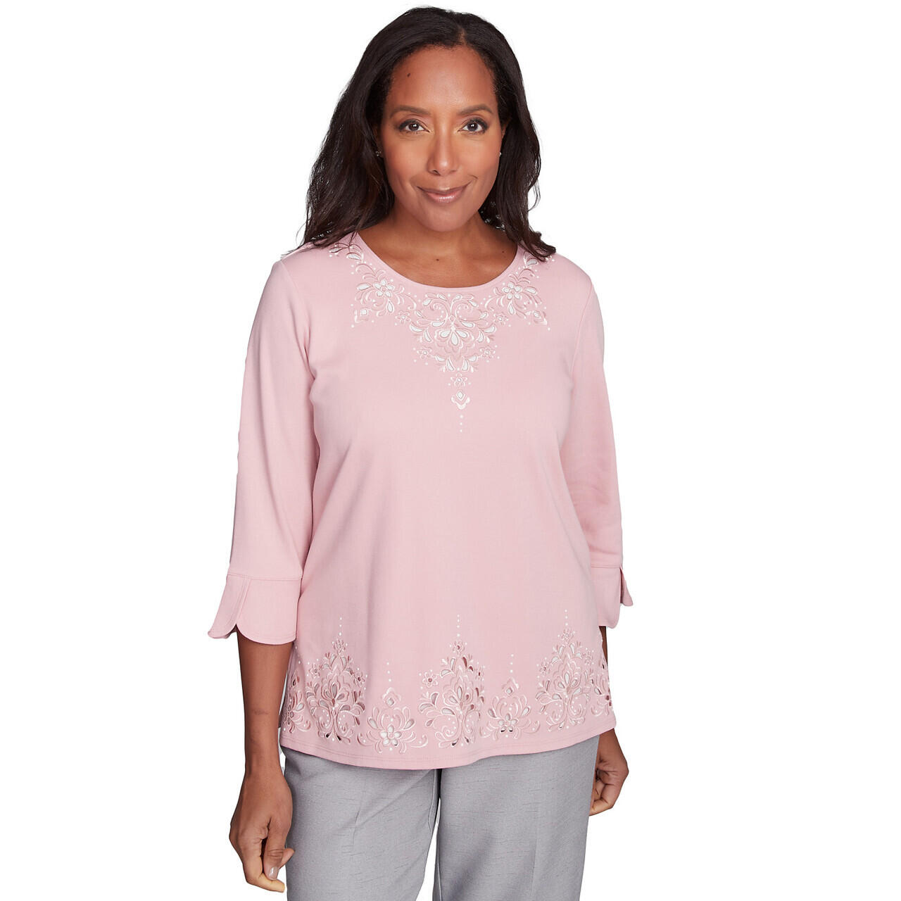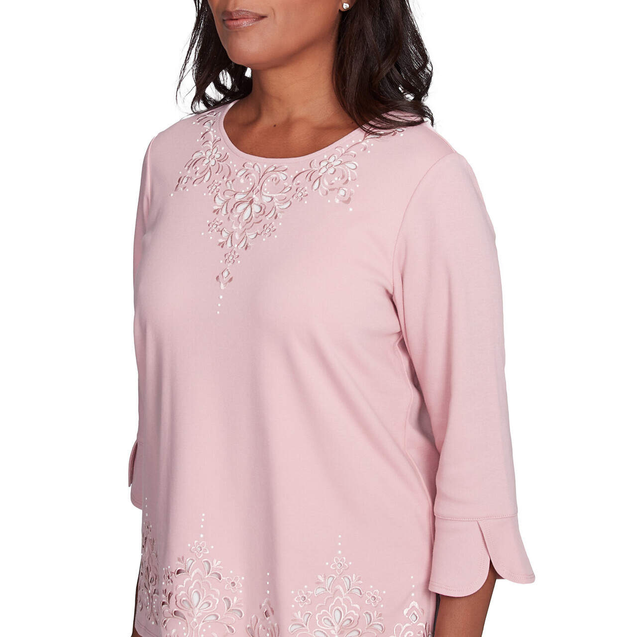 This top is a true statement of refined allure, with delicate cut outs along the neck and hemline that catch the light with every movement. The three-quarter bell sleeves add a breezy, feminine touch, flowing effortlessly with your stride. A crisp straight hemline anchors the design, creating a balanced and flattering fit. With just the right amount of shimmer and flair, this piece is perfect for adding a touch of luxe to any occasion, bringing both grace and understated glamour to your wardrobe.