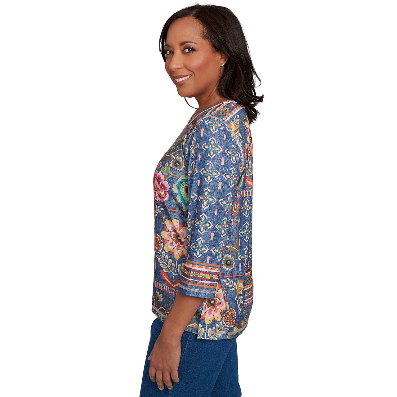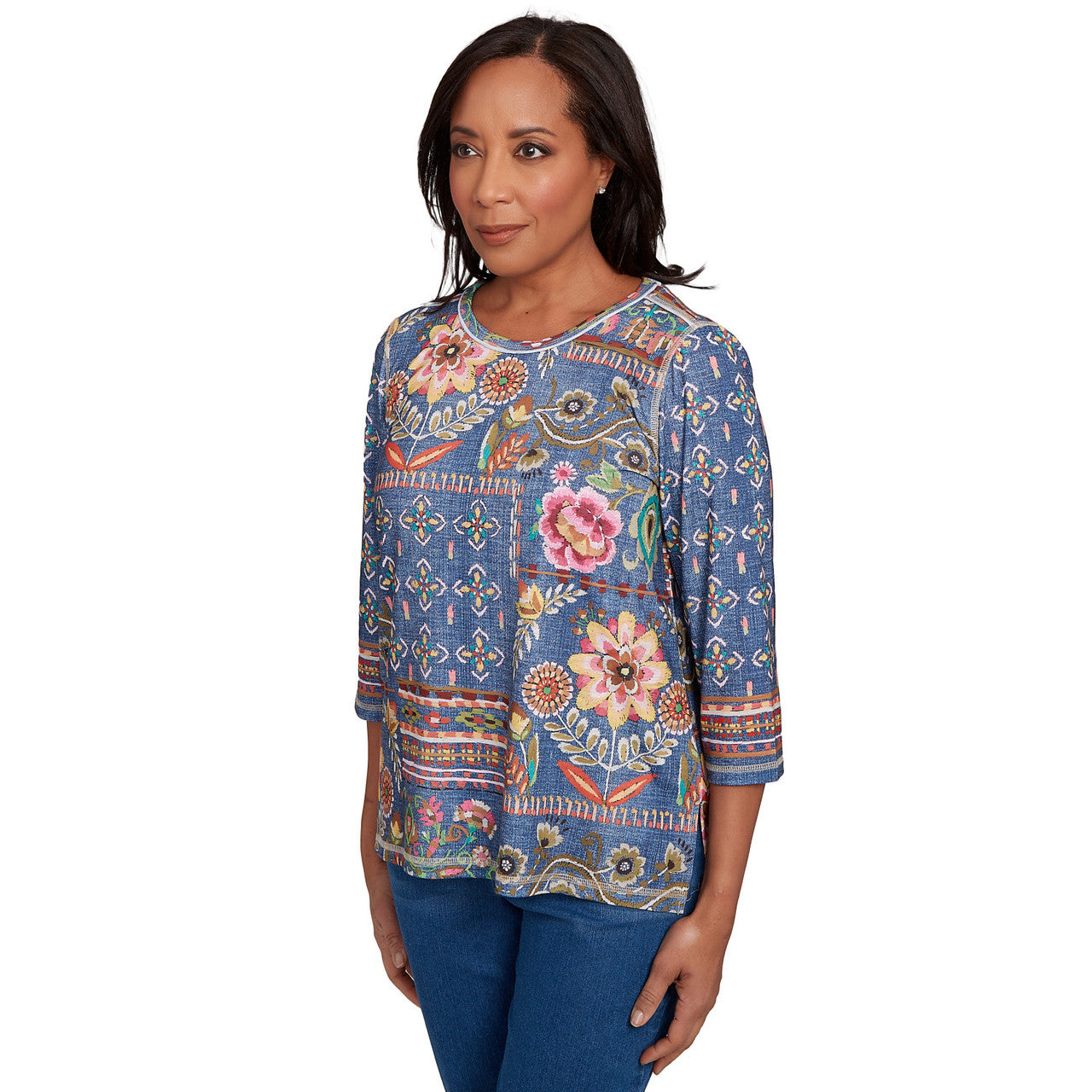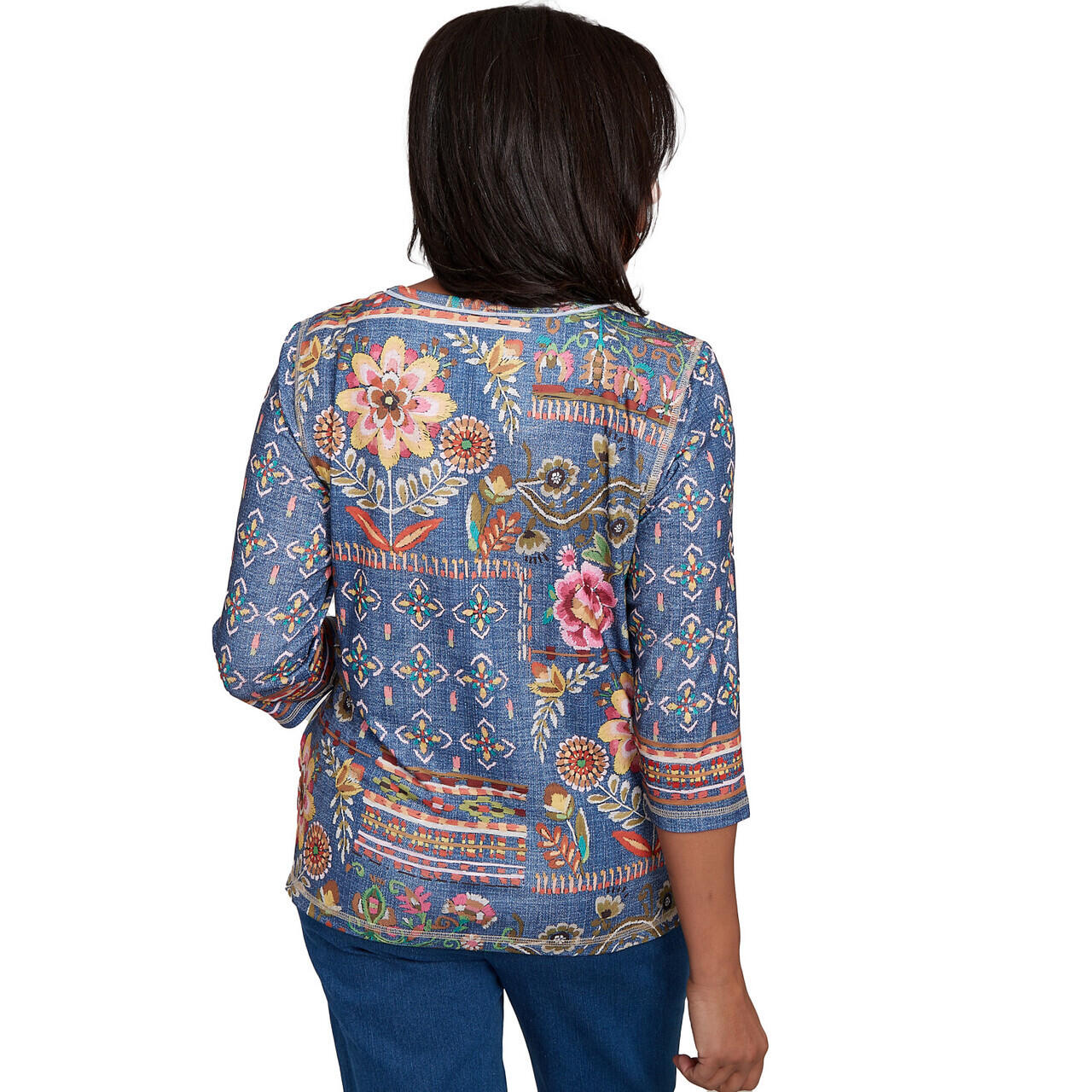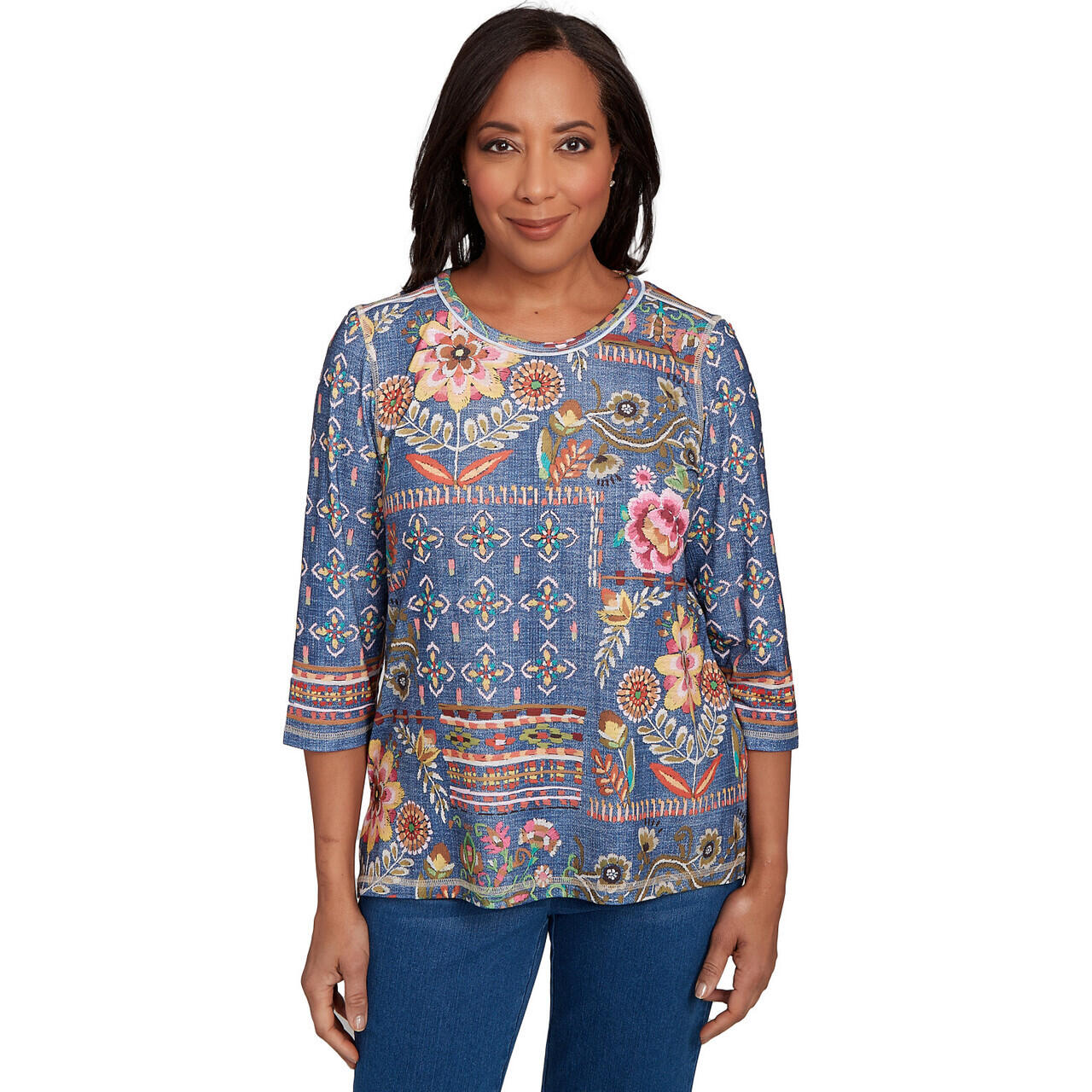 This denim top is full of fun and florals, featuring vibrant floral patch detailing, a crew neckline, and three-quarter sleeves. The straight hemline adds a polished finish, making it a playful yet stylish addition to your wardrobe.