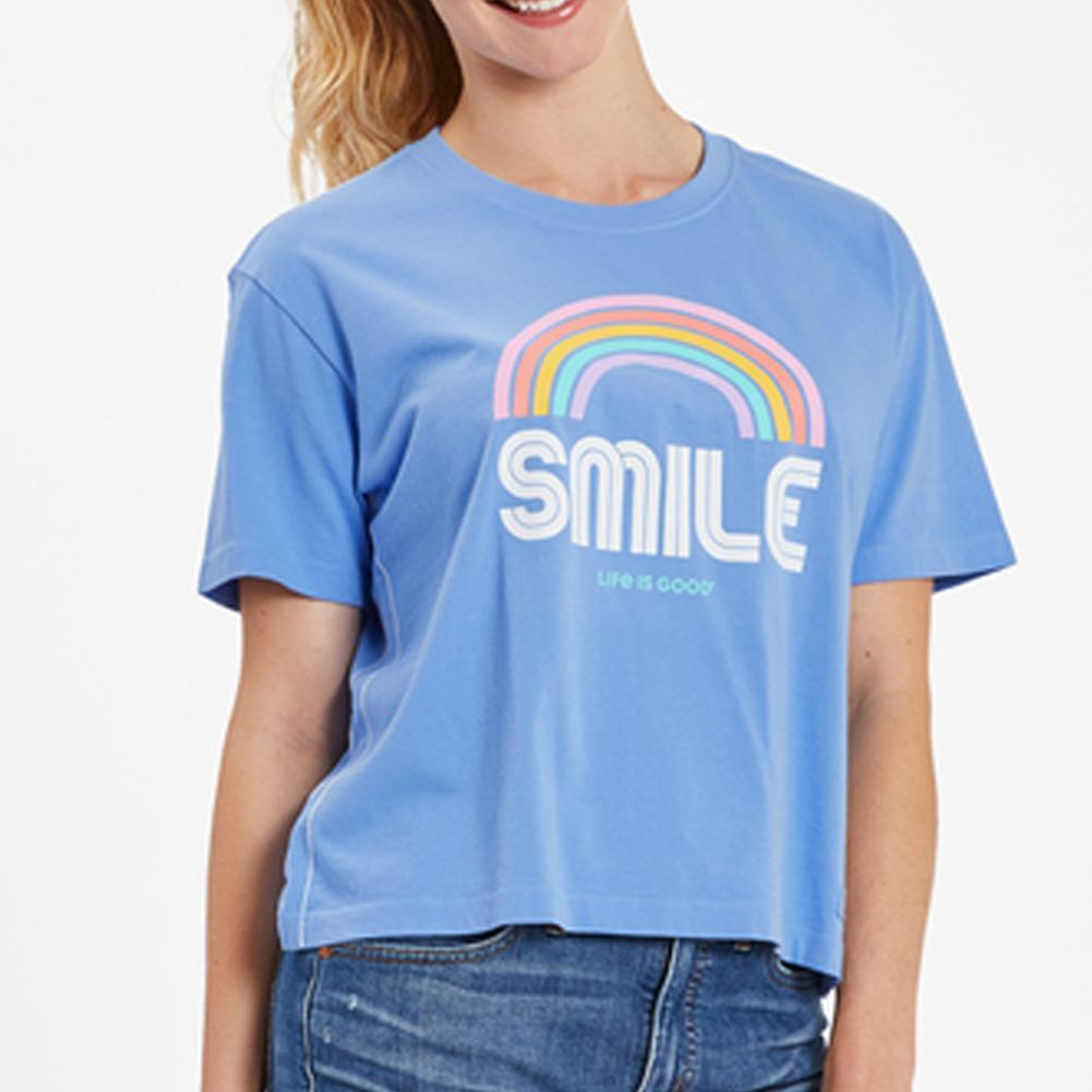 Life is Good Women's Smile Rainbow Boxy Crusher Tee relaxed-fit Crusher Tee, in a cool cropped (but not too cropped) length. Washed for everyday softness and falls loosely off the body.
