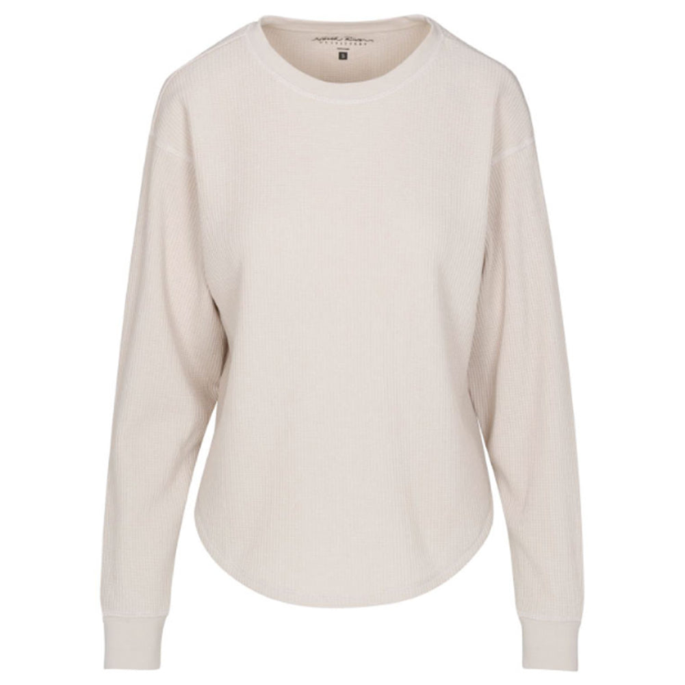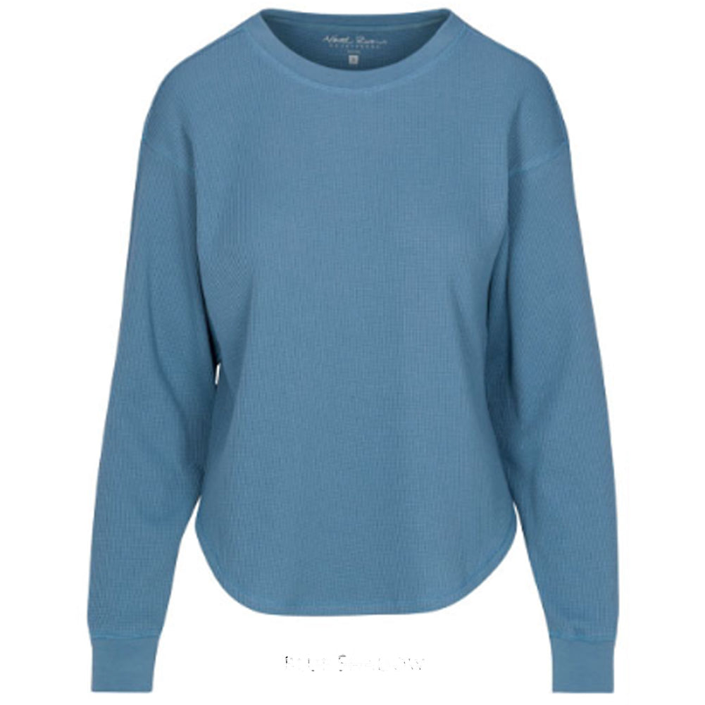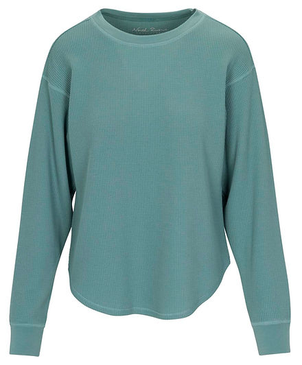 The top has a round neckline and long sleeves. The fabric appears to be Linville Waffle Crew and comfortable, with a ribbed texture.