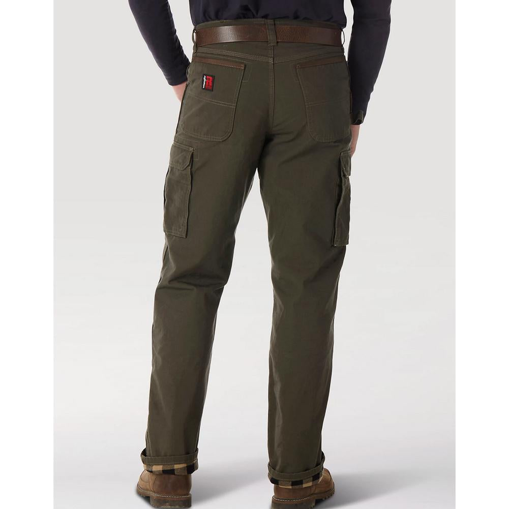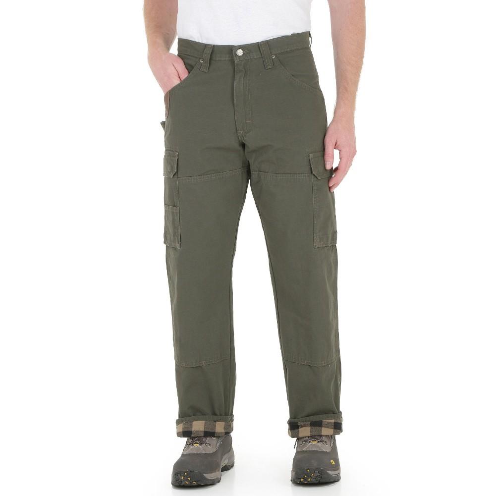Wrangler Riggs Workwear Lined Ripstop Ranger Pants. Roomy side cargo pockets with flaps and concealed snaps. Reinforced knees with bottom vent. Right side hammer loop. 1000 Denier Cordura® lined back pockets. Patented leather tape measure reinforcement on right front pocket. 13-inch deep front pockets. Constructed from 10 oz. 100% cotton ripstop fabric with our exclusive room2move™ fit: Improved fit in seat, thigh, knee and bottom opening. Action gusset. 3.75 oz. 100% cotton brushed flannel lining.