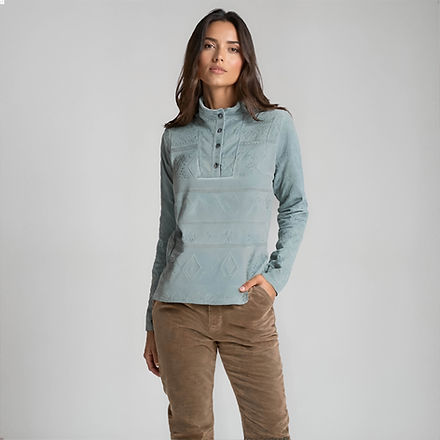 Long-sleeved shirt with a high collar and a button-down front. The shirt appears to be made of a comfortable fabric and has a Catawaba Embossed Mock Neck pattern on the front. The overall style of the shirt is casual and comfortable.
