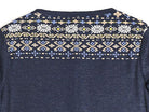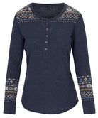 The top has a round neckline and a button-down front. The sleeves are decorated with a colorful, geometric pattern. The pattern is made up of small, repeating geometric shapes and lines, creating a repeating design. The fabric is make of a Honey Lake Waffle Henley soft and comfortable, perfect for a casual day out.