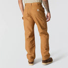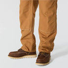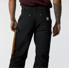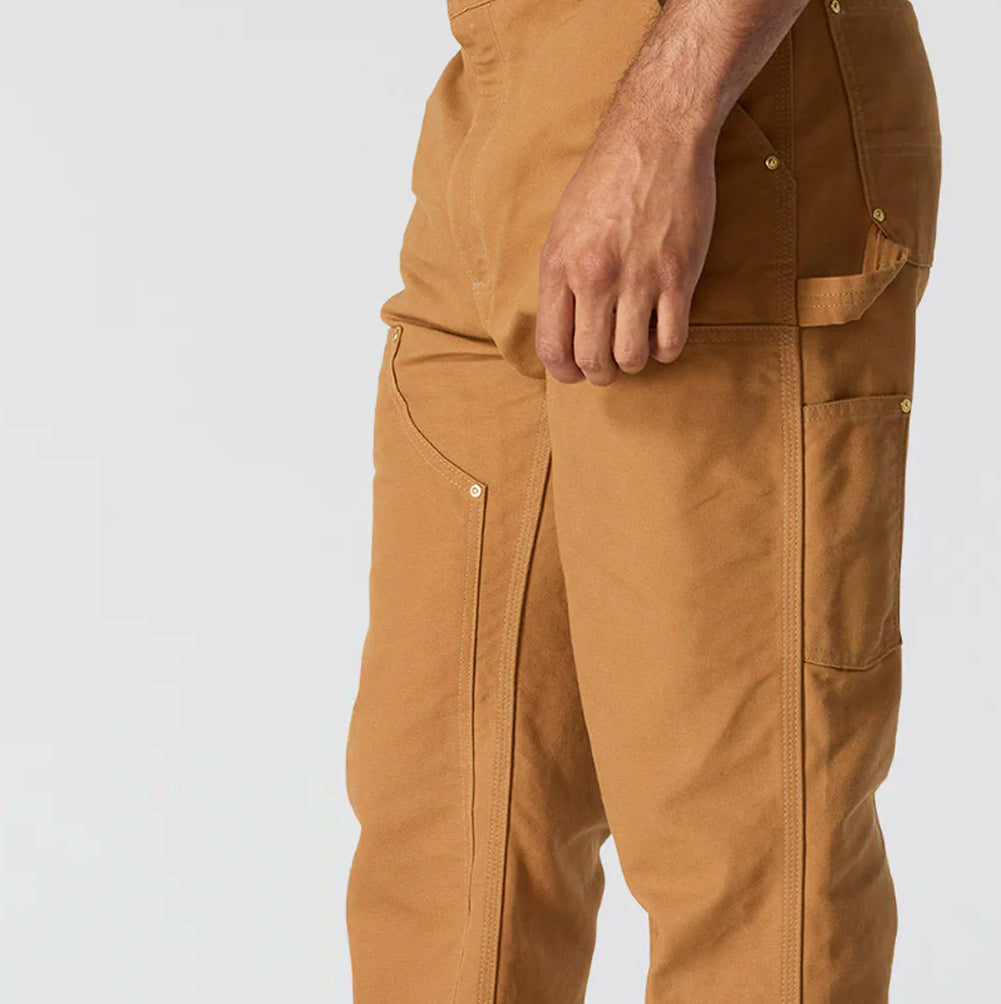 Hard work in, hard work out. Behind every pair of these pants are 61 pairs of hands that cut, sew, hem, and triple-stitch the 28 pieces that form the classic B01. So before they even show up on the jobsite, they've already lived through several shifts of hard work. These men's dungarees have changed very little since they were introduced in 1939. Rugged design featuring heavy-hauling back pockets and a double layer at the knees. Our heavyweight firm-hand duck is the most durable canvas out there.