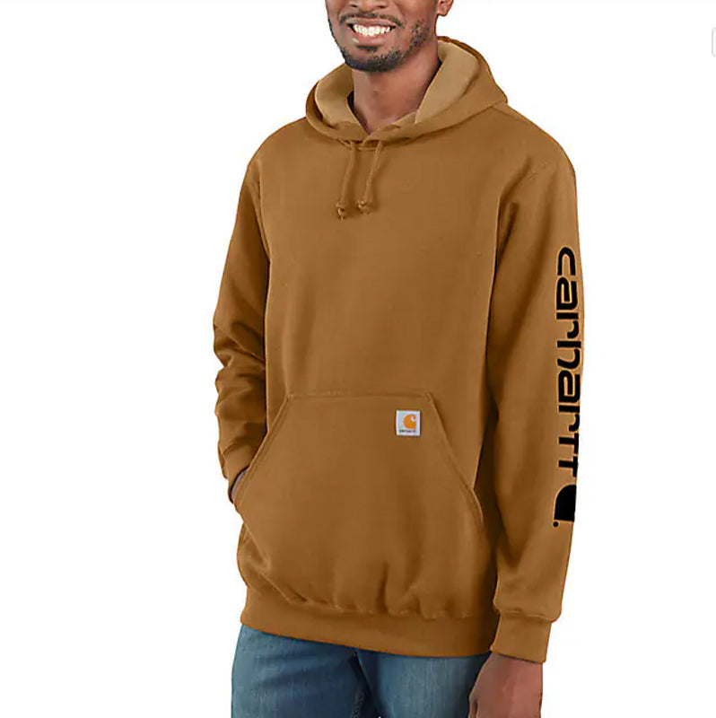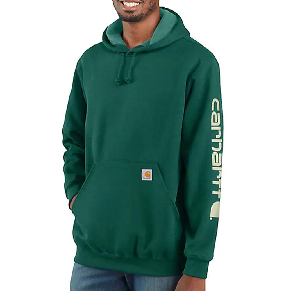 Carhartt Men's Loose Fit Midweight Logo-Sleeve Graphic Hoodie (Big) for everyday wear. Cut the morning chill with this men's sweatshirt. A traditional cotton blend makes for versatile layering. Carhartt durability and familiar hoodie comfort mean you can strap on your tool belt or relax with equal ease. A midweight cotton blend offers everyday versatility.