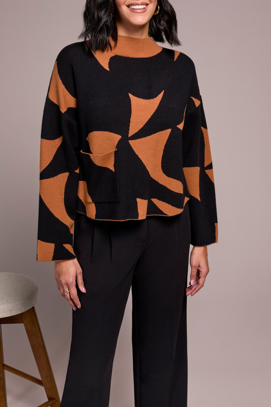 Abstract Print Mock Neck Sweater With Pocket - 23150-8277