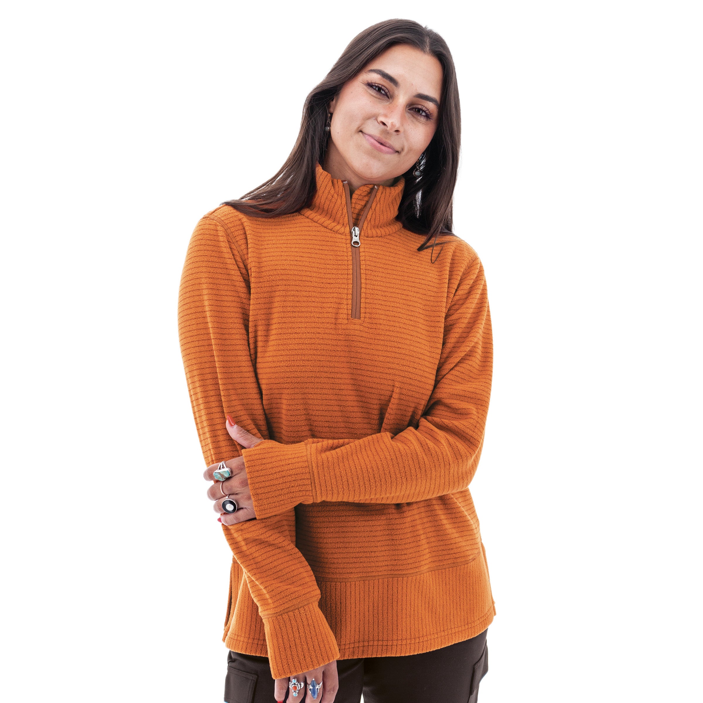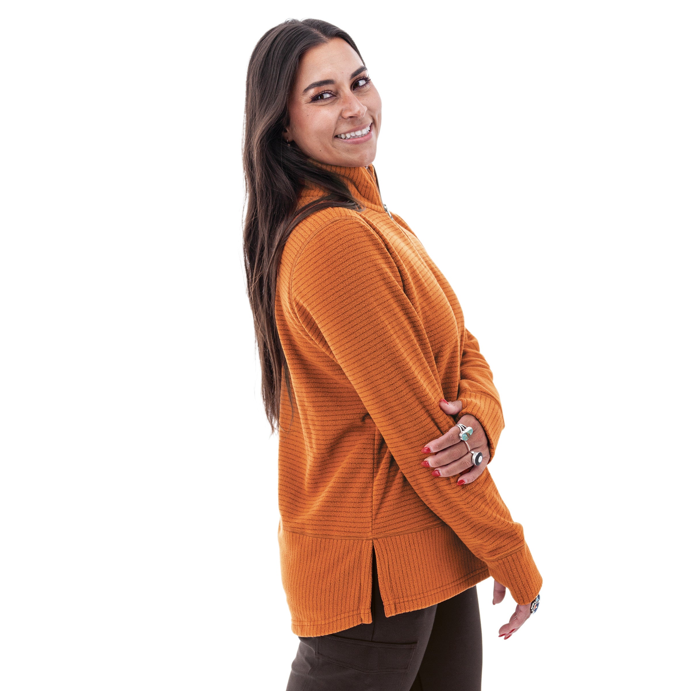 The Marlowe 1/4 Zip Fleece is winter's favorite because not only is it warm and cute, but its versatile style is crafted from eco-conscious materials. The fabric utilizes 95% recycled polyester which reclaims plastic waste (reducing our landfill impact!) and processes with significantly less C02 emissions than virgin polyester. Love this style season after season with a classic design that is sure to weather the test of time. We love the high neck as well as the added length at the back. The thumbholes nod to athleisure but the ribbed fabric looks polished for any of the day's demands. Pair with leggings for a morning walk or style with pants and cute boots for a flattering casual look.