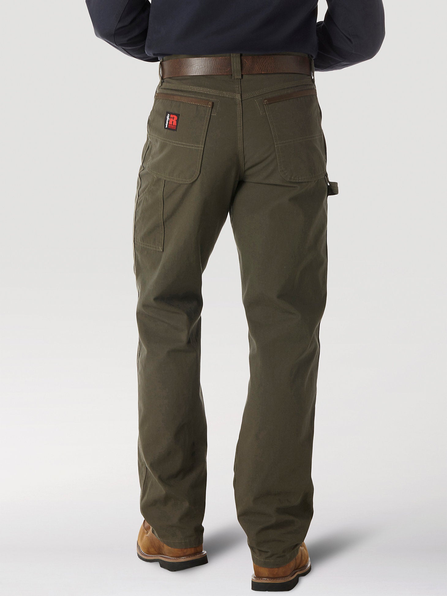 Wrangler® RIGGS Workwear® Carpenter Pant a Classic for workday and weekend carpenters. Wrangler's exclusive room2move™ fit offers a better fit in the seat, thigh, knee and bottom leg opening. The action gusset allows ease of movement. Wrangler's patented leather tape measure reinforcement on right front pocket is handy as well as reinforced. 1000 Denier Cordura® lined back pockets.