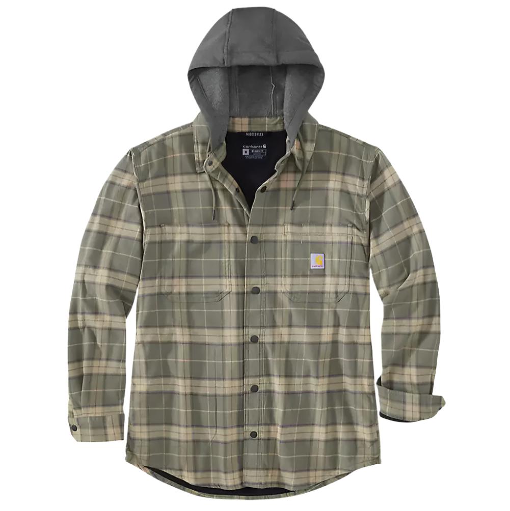 Stay warm while you work. This men's shirt jac is built for cold weather with a soft fleece lining and an attached hood. Stretch flannel and a relaxed fit allow you to lift boxes and swing a hammer with ease.