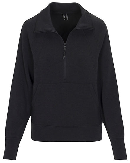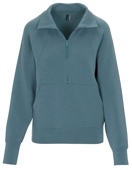 Women's sweatshirt with a half zipper on the front. The fabric appears to be soft and comfortable. The sleeves have a ribbed texture. The overall style of the sweatshirt is casual and relaxed.